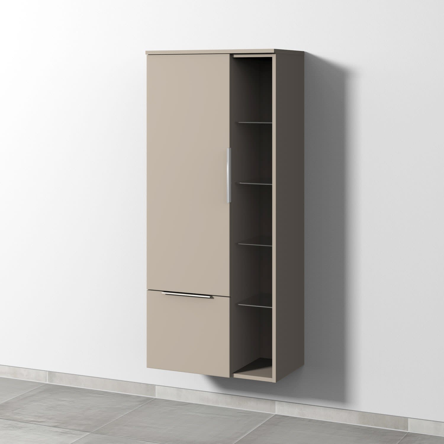Sanipa 3way Stauraumschrank 60 cm, 1 Tür Anschlag links mit Aufsatzgriff, 1 offenes Fach, 1 Auszug