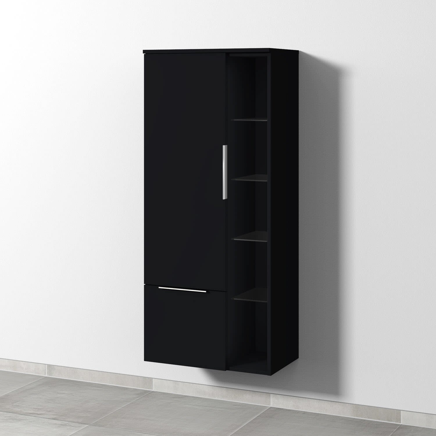 Sanipa 3way Stauraumschrank 60 cm, 1 Tür Anschlag links mit Aufsatzgriff, 1 offenes Fach, 1 Auszug