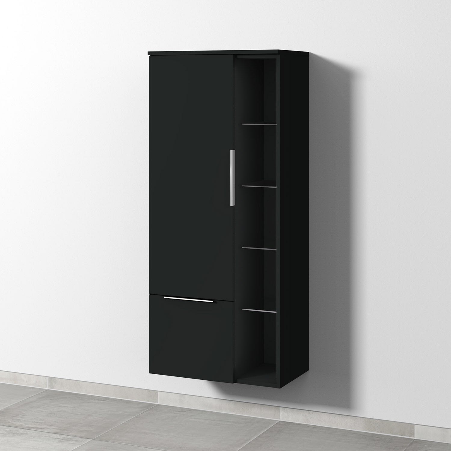 Sanipa 3way Stauraumschrank 60 cm, 1 Tür Anschlag links mit Aufsatzgriff, 1 offenes Fach, 1 Auszug