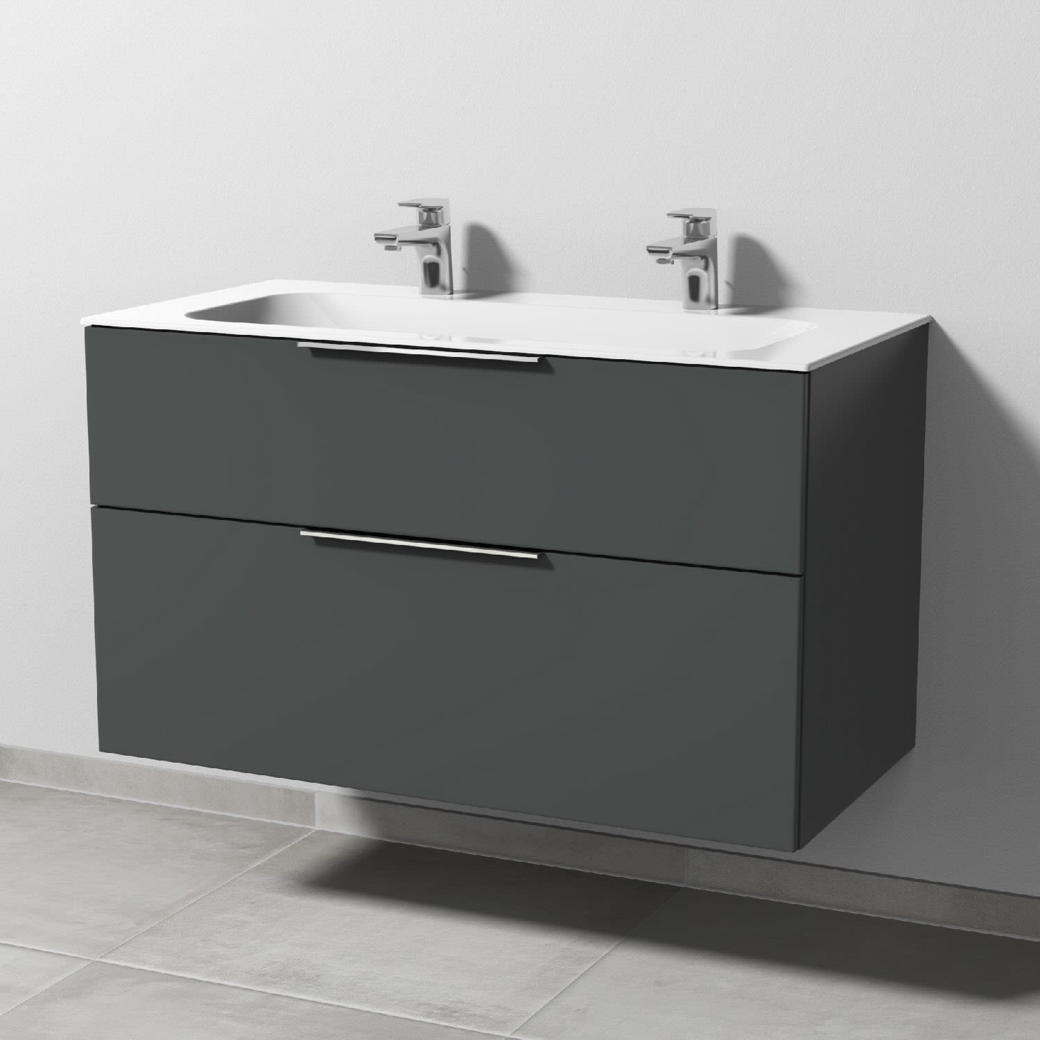 Sanipa 3way Unterschrank 100 cm, 2 Auszüge, Aufsatz-Griffe mit Villeroy & Boch Finion Doppelwaschtisch