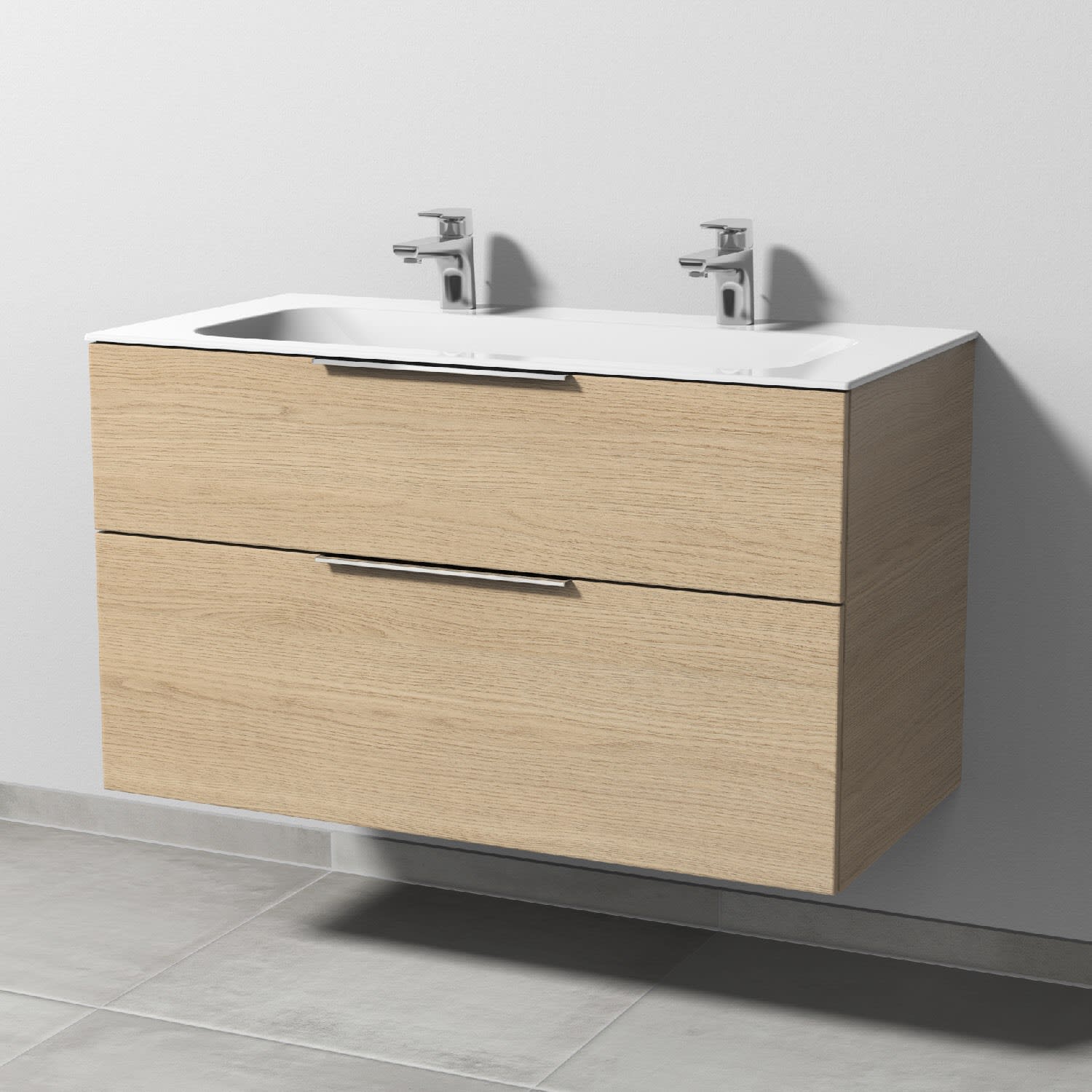 Sanipa 3way Unterschrank 100 cm, 2 Auszüge, Aufsatz-Griffe mit Villeroy & Boch Finion Doppelwaschtisch