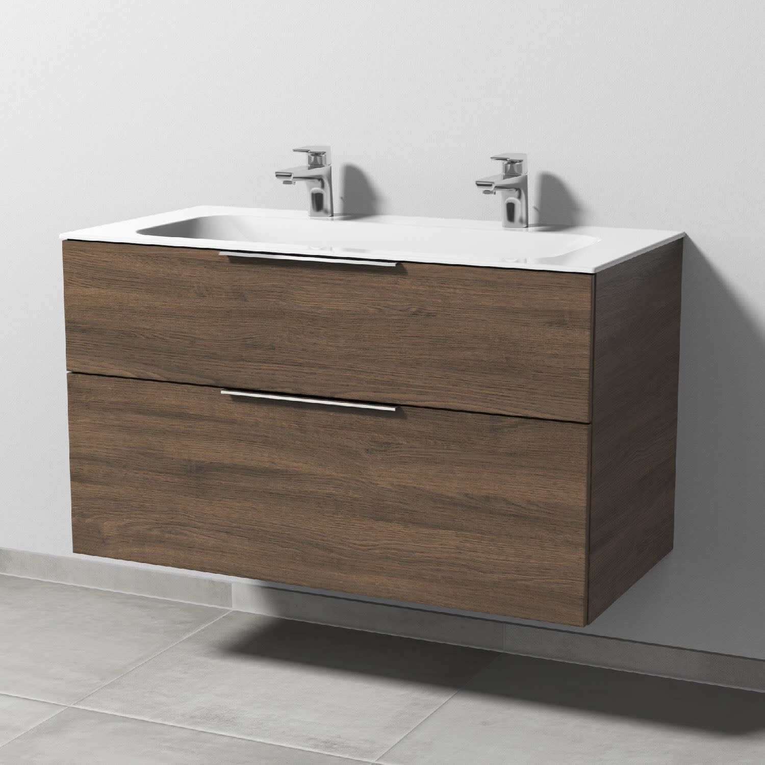 Sanipa 3way Unterschrank 100 cm, 2 Auszüge, Aufsatz-Griffe mit Villeroy & Boch Finion Doppelwaschtisch
