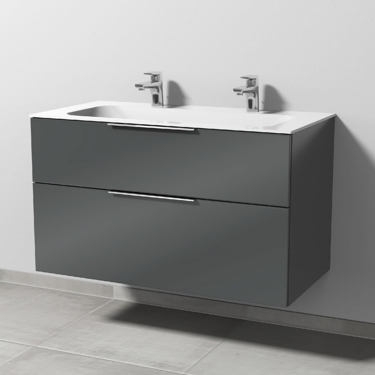 Sanipa 3way Unterschrank 100 cm, 2 Auszüge, Aufsatz-Griffe mit Villeroy & Boch Finion Doppelwaschtisch