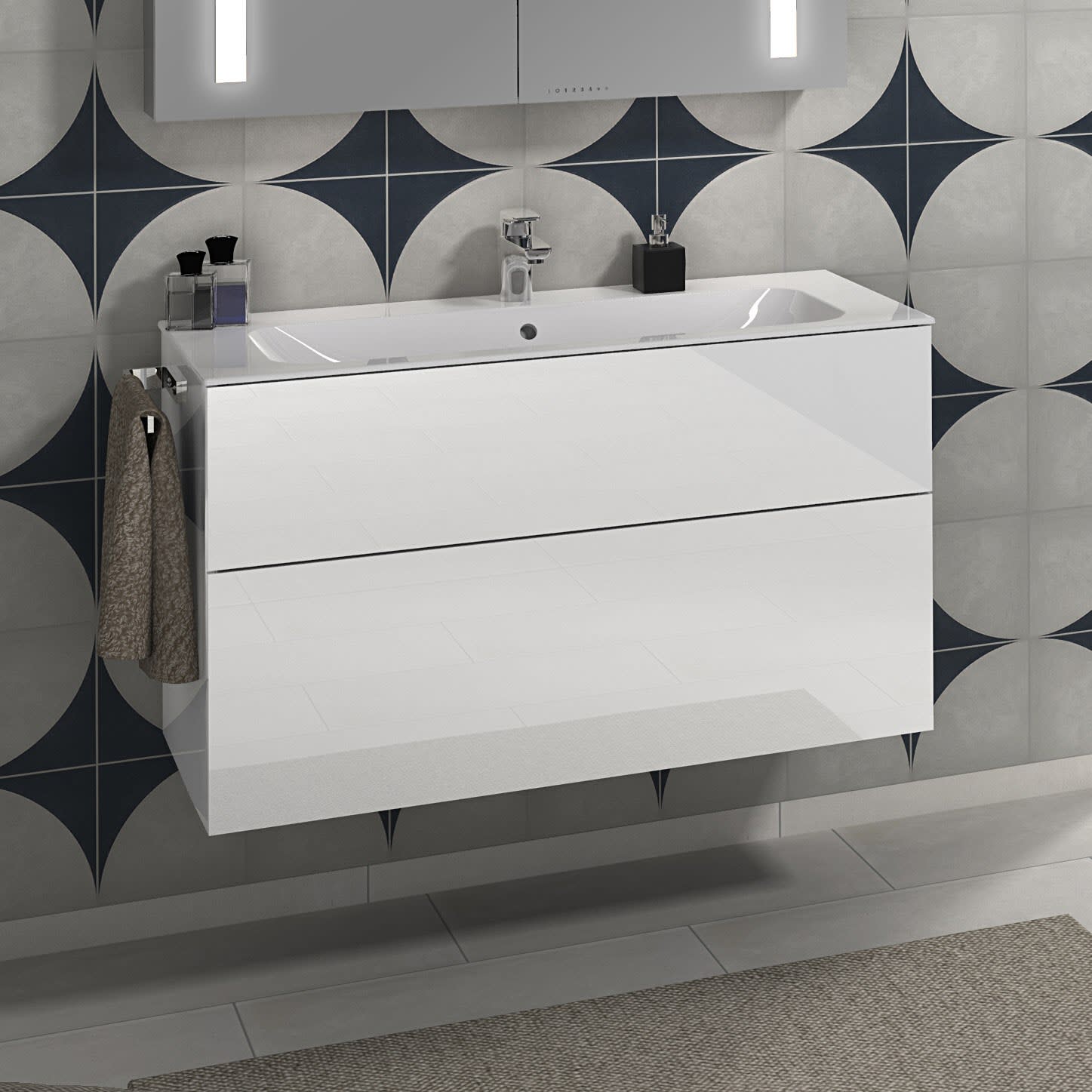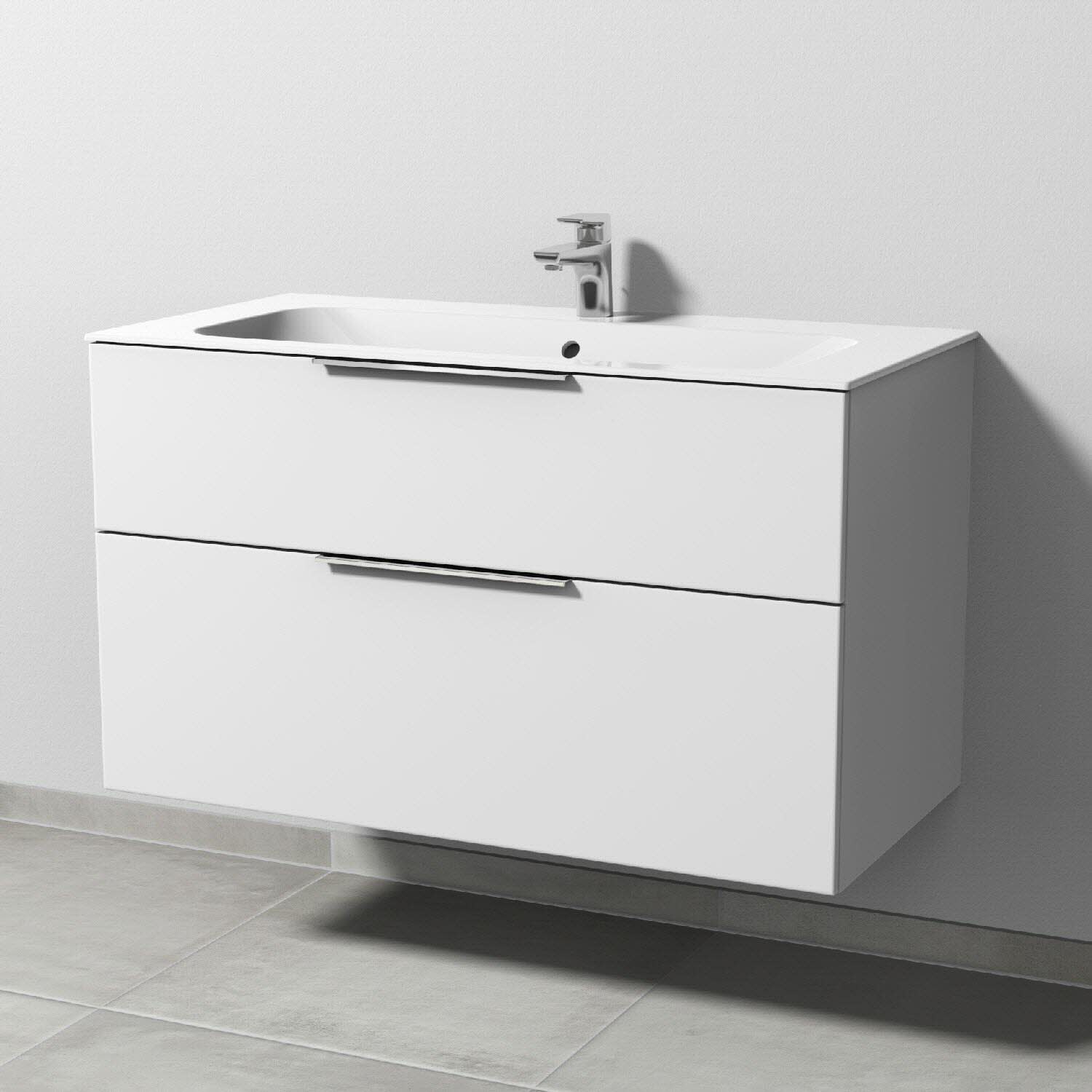 Sanipa 3way Unterschrank 100 cm, 2 Auszüge, Aufsatz-Griffe schwarz matt mit Villeroy & Boch Finion Waschtisch