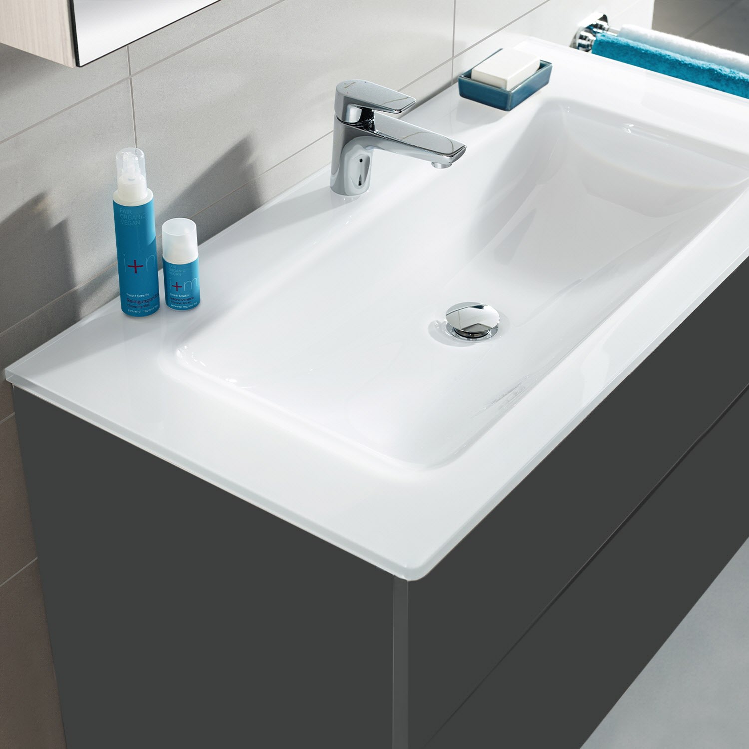 Der Glas-Waschtisch ist auf Anfrage auch ohne Armaturbohrung möglich (Mehrpreis).