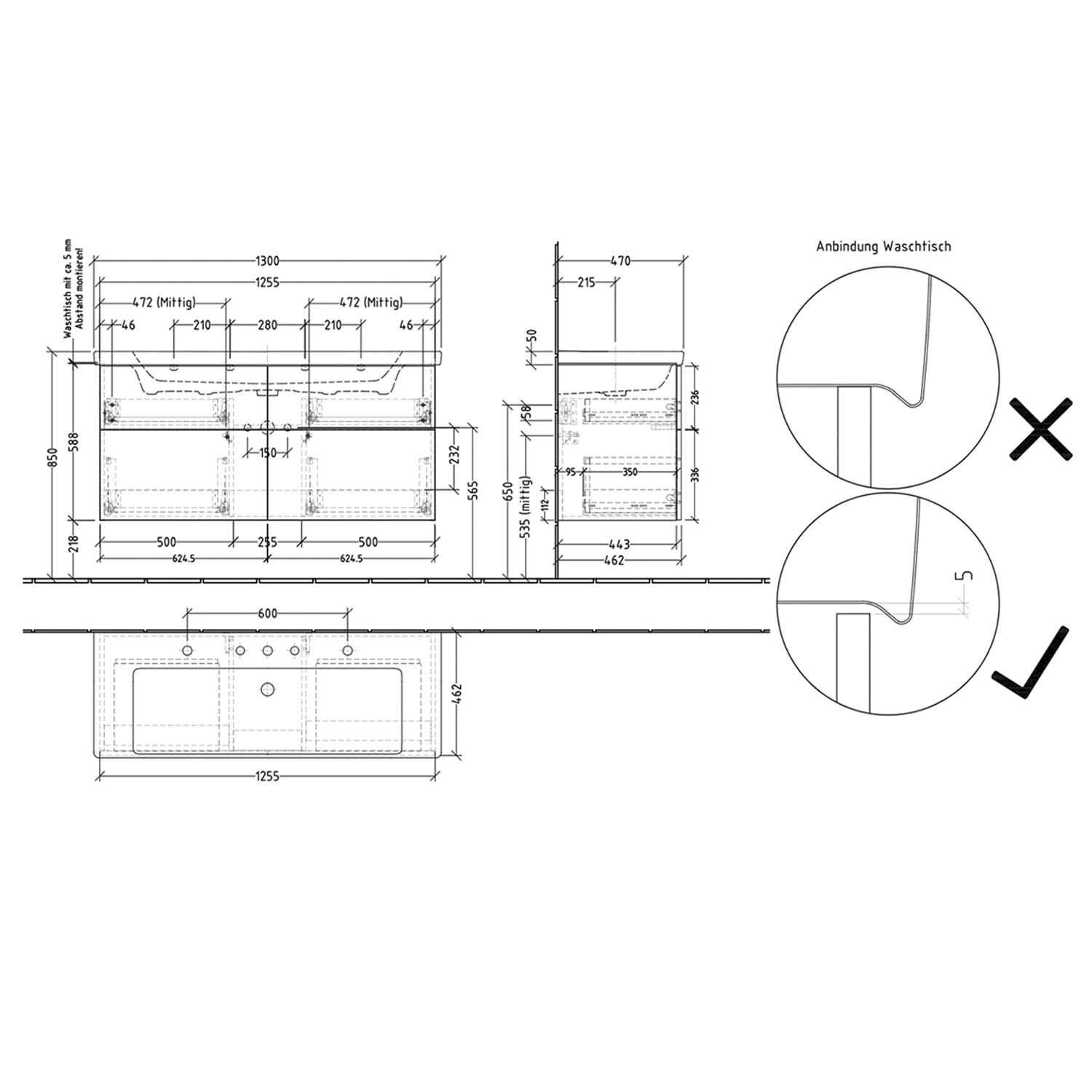 - Maße: Tiefe 47 cm, Höhe 5 cm, Tiefe Beckenkumme 12,3 cm