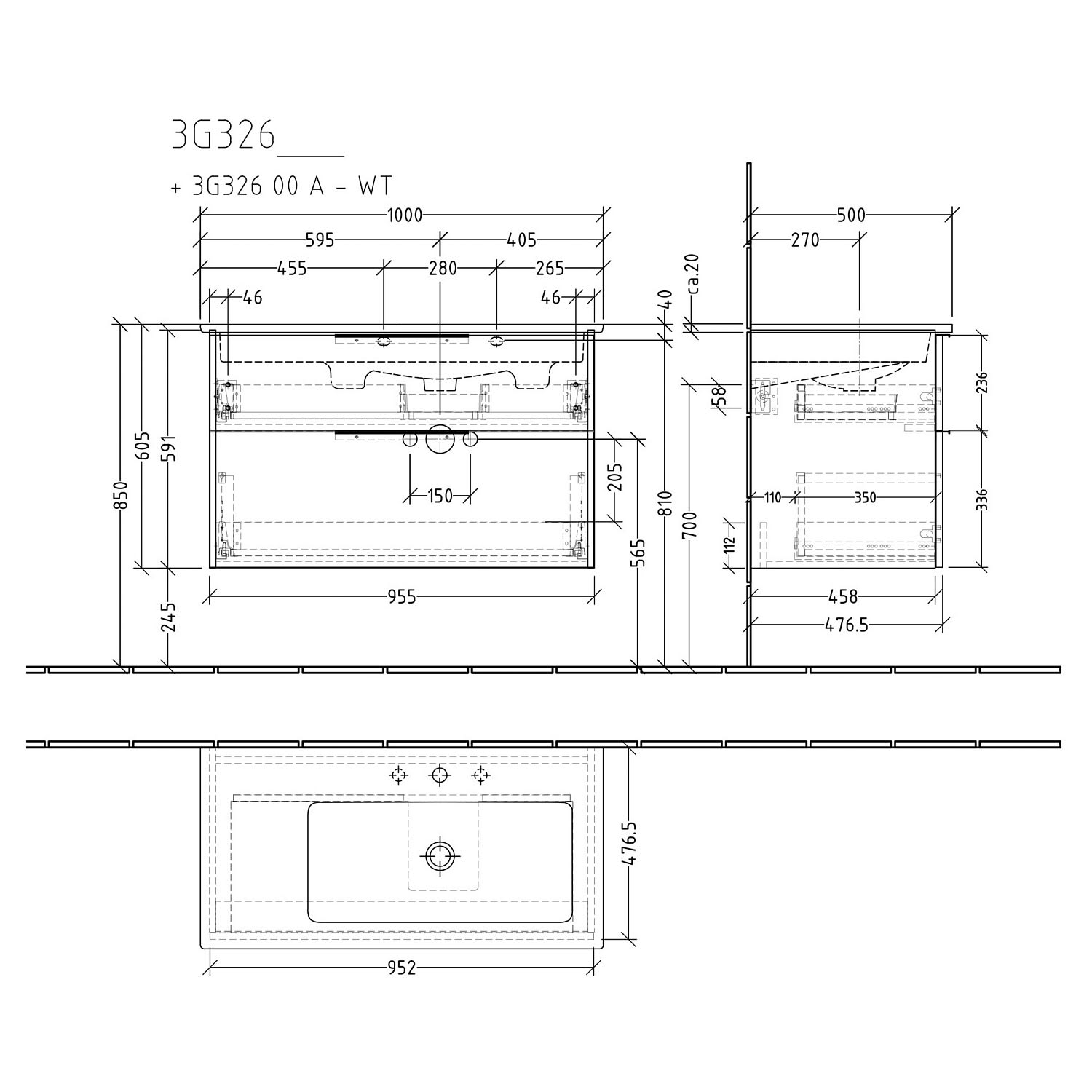 - wandhängend, 2 Metall-Vollauszüge
