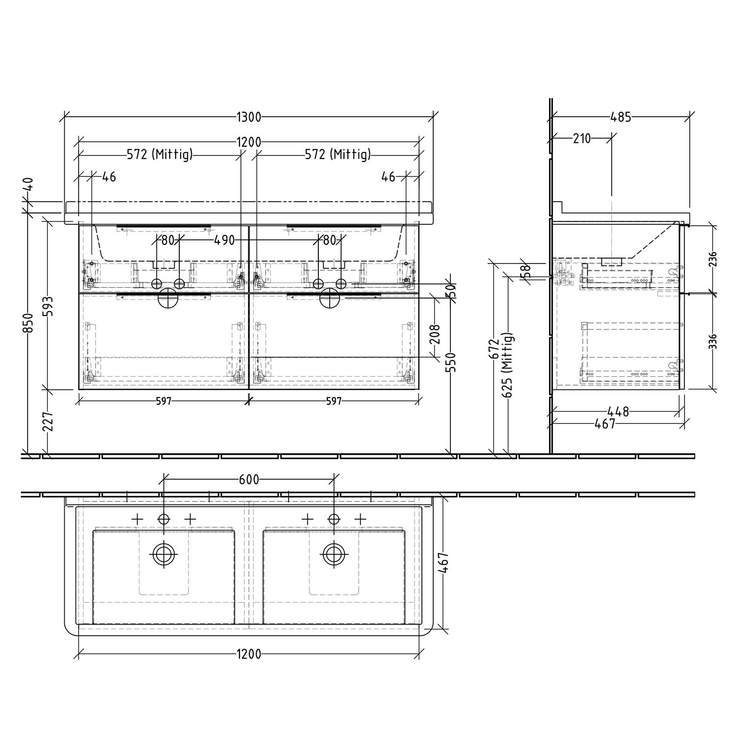 Sanipa 3way Waschtischunterbau für Keramik-Doppelwaschtisch Starck 3 130 cm, 4 Auszüge mit Aufsatzgriff