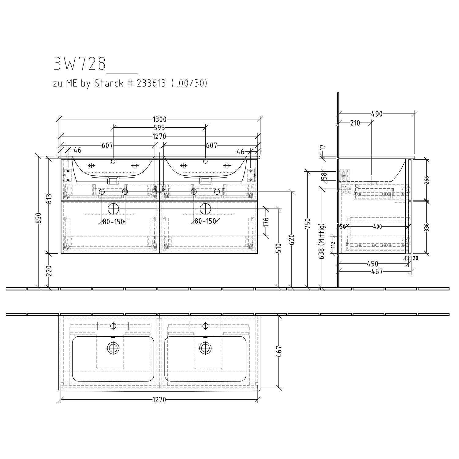 Sanipa 3way Waschtischunterbau für Keramik-Doppelwaschtisch ME by Starck 130 cm, 4 Auszüge mit Griffleisten