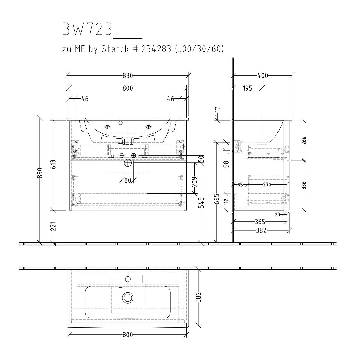 Sanipa 3way Waschtischunterbau für Keramik-Waschtisch ME by Starck 83 cm, 2 Auszüge mit Griffleisten, geringere Tiefe