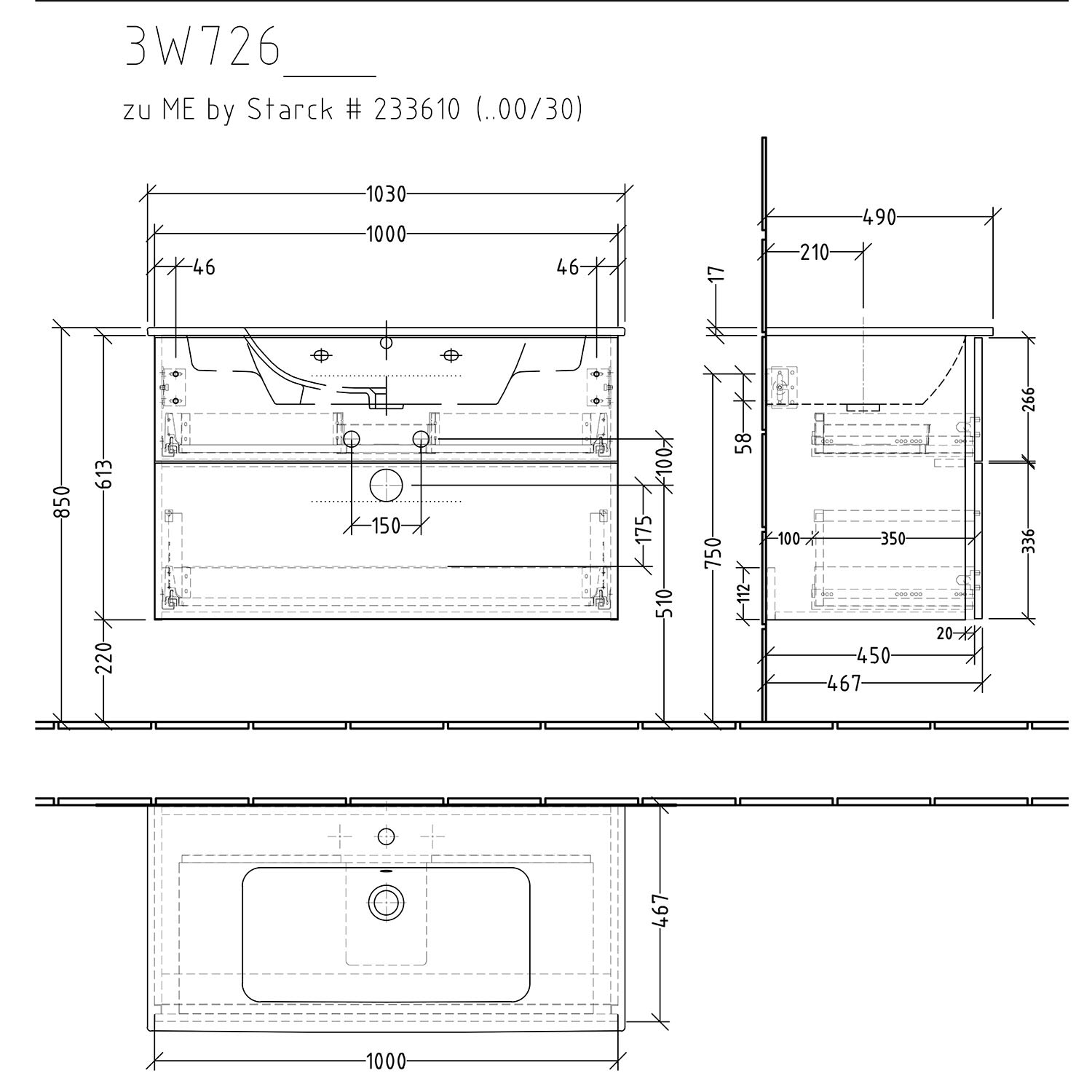 Sanipa 3way Waschtischunterbau für Keramik-Waschtisch ME by Starck 103 cm, 2 Auszüge mit Griffleisten
