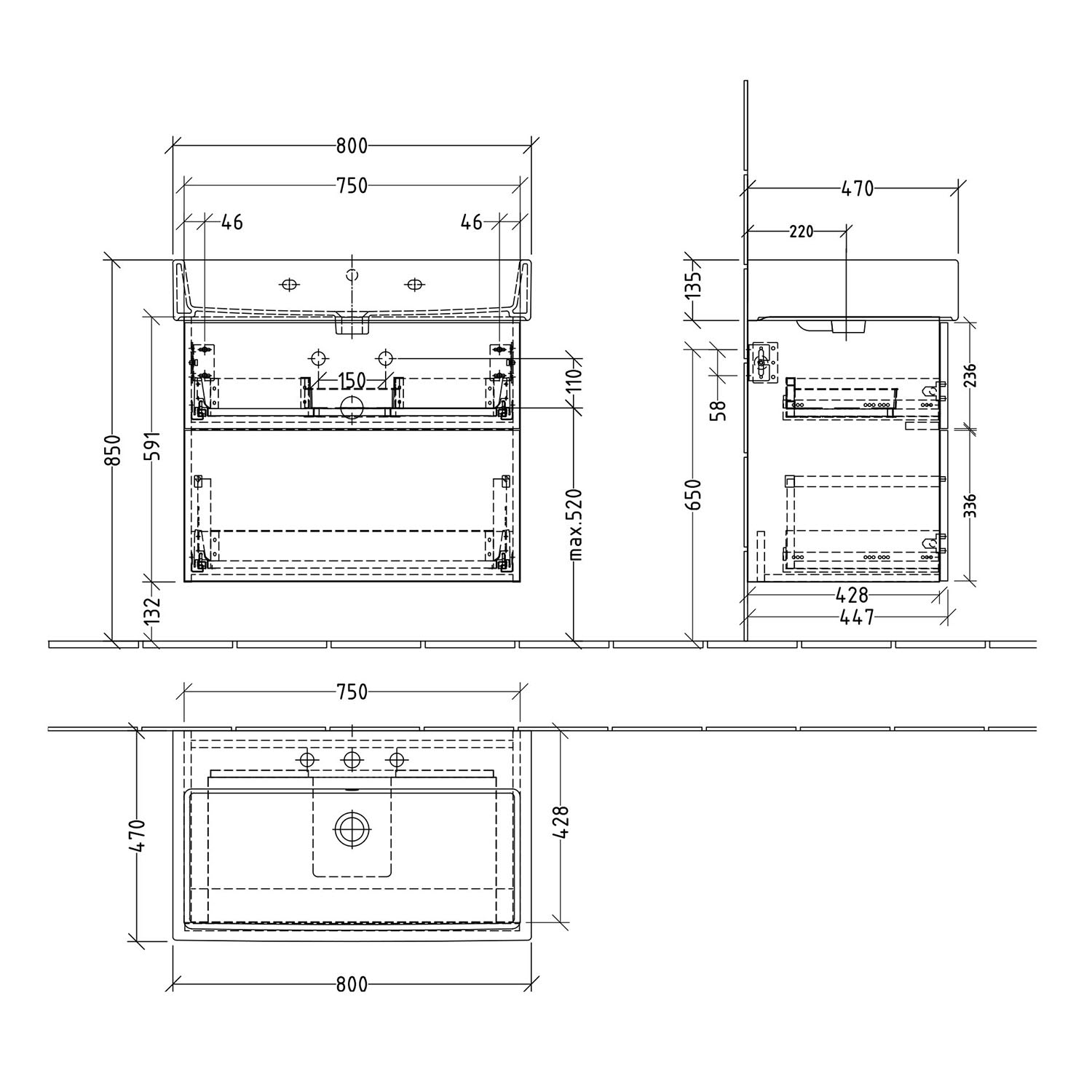 Sanipa 3way Waschtischunterbau für Keramik-Waschtisch Vero Air 80 cm, 2 Auszüge mit Push to open