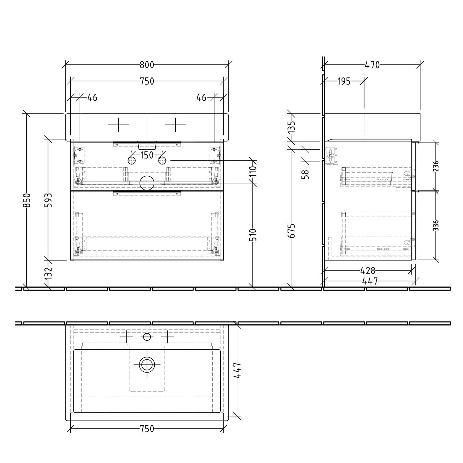 Sanipa 3way Waschtischunterbau für Keramik-Waschtisch Vero 80 cm, 2 Auszüge mit Aufsatzgriff