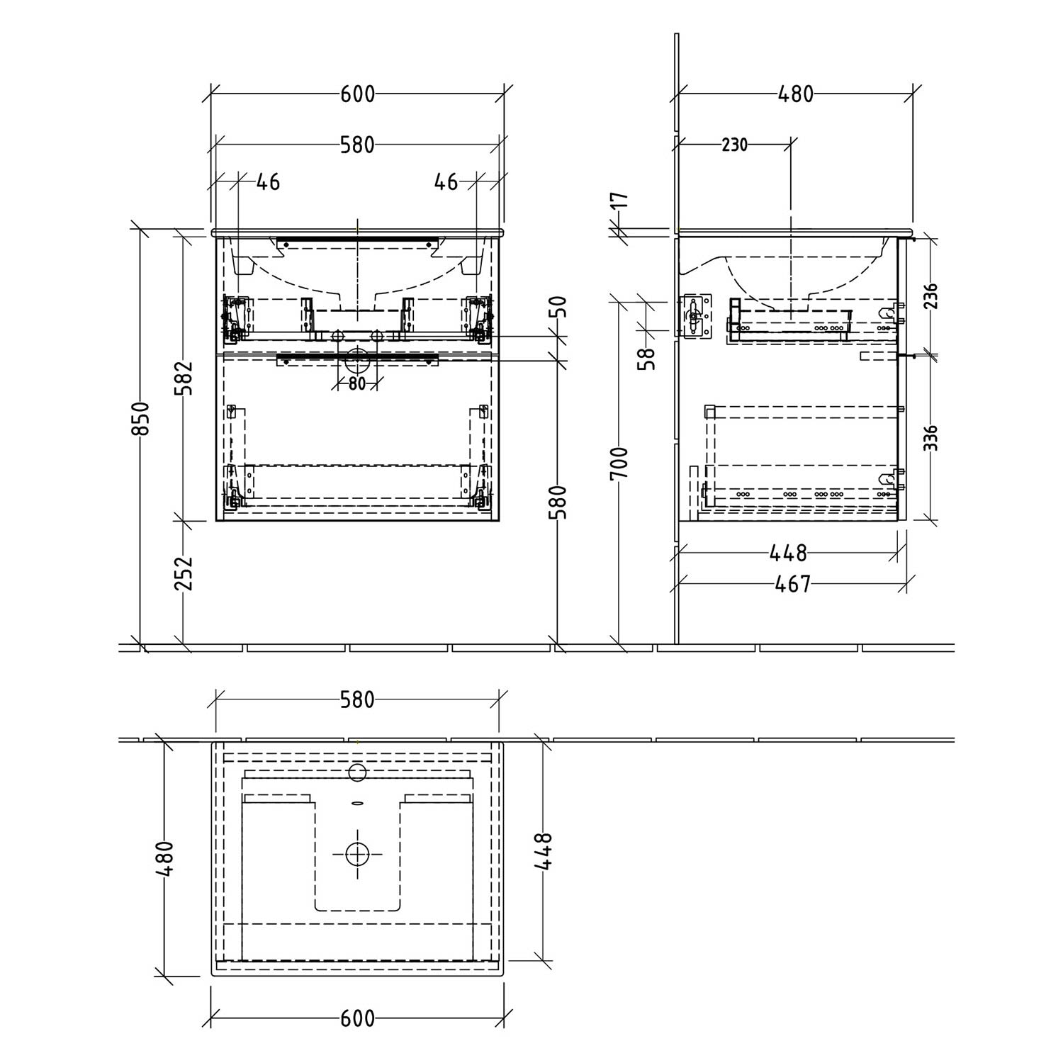 Sanipa 3way Waschtischunterbau für Keramik-Waschtisch Acanto Slim 60 cm, 2 Auszüge mit Aufsatzgriff