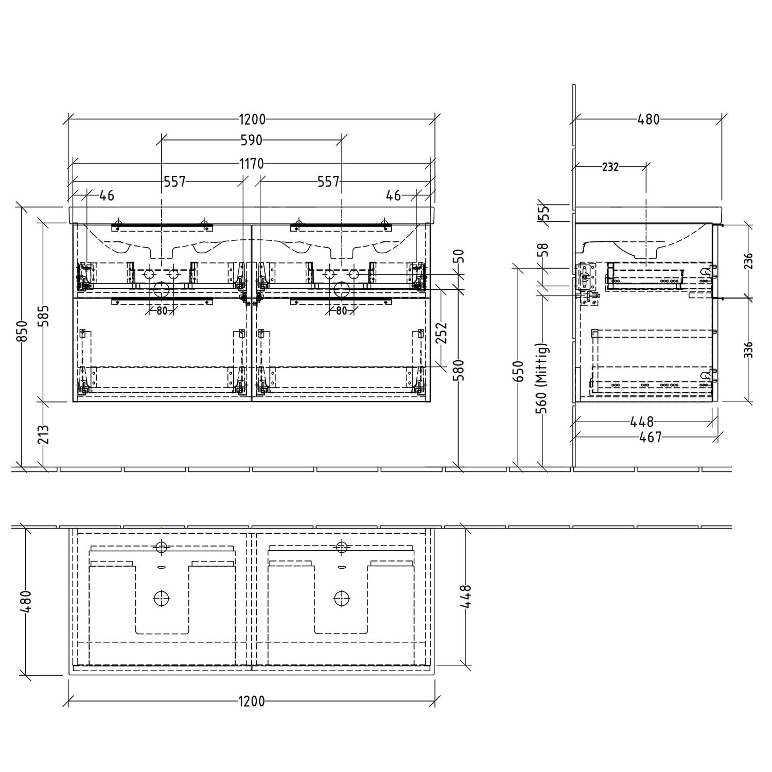 Sanipa 3way Waschtischunterbau für Keramik-Doppelwaschtisch Acanto 120 cm, 4 Auszüge mit Aufsatzgriff