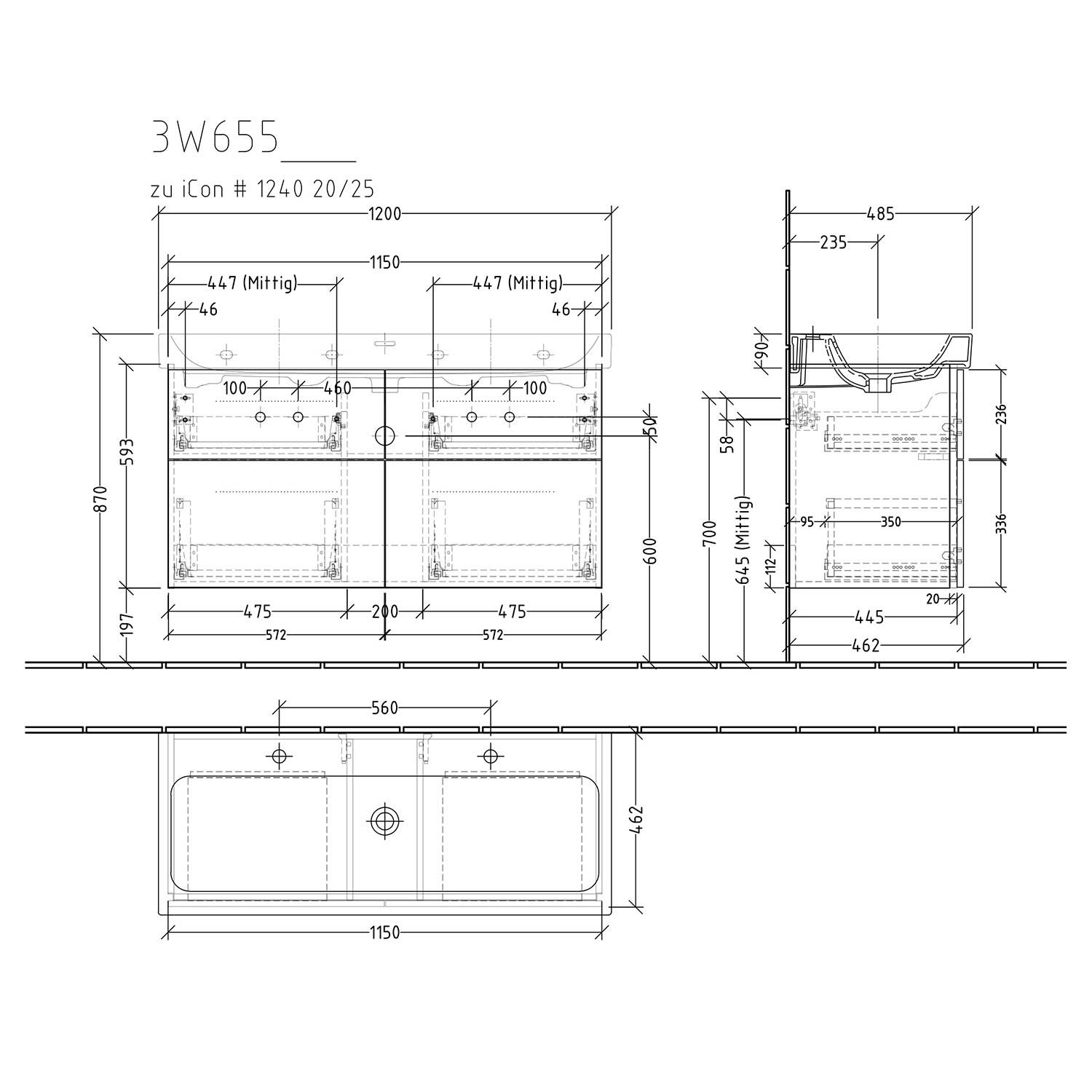 Sanipa 3way Waschtischunterbau für Keramik-Waschtisch iCon 120 cm, 4 Auszüge mit Griffleisten