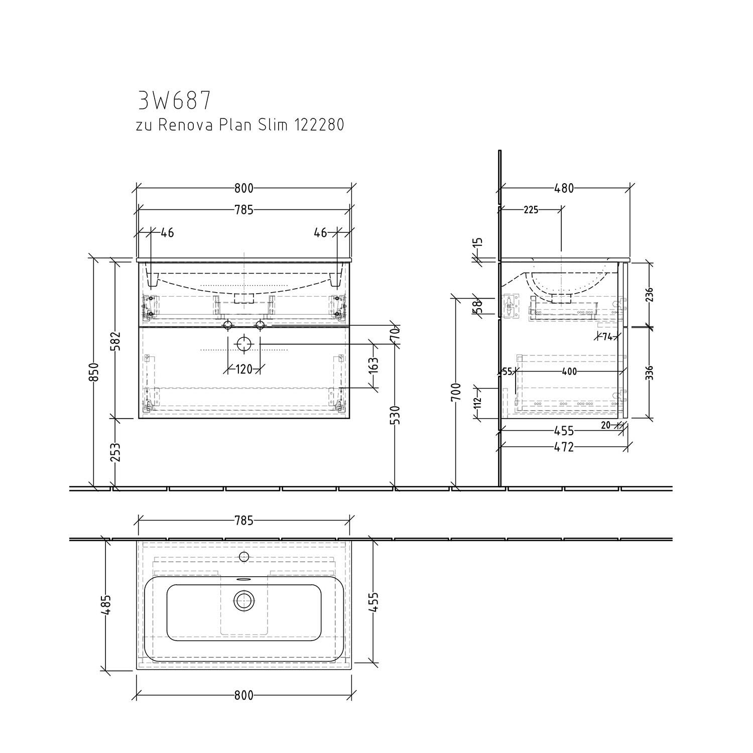 Sanipa 3way Waschtischunterbau für Keramik-Waschtisch Renova Plan Slim 80 cm, 2 Auszüge mit Griffleisten