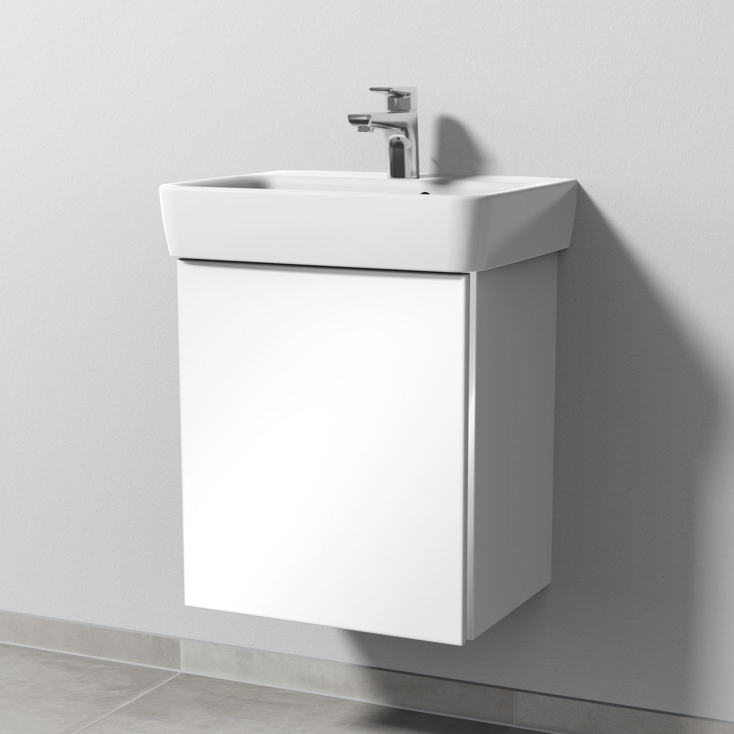 Sanipa 3way Waschtischunterbau für Keramik-Waschtisch Renova Plan 50 cm, 1 Tür, Anschlag links, mit Griffleiste