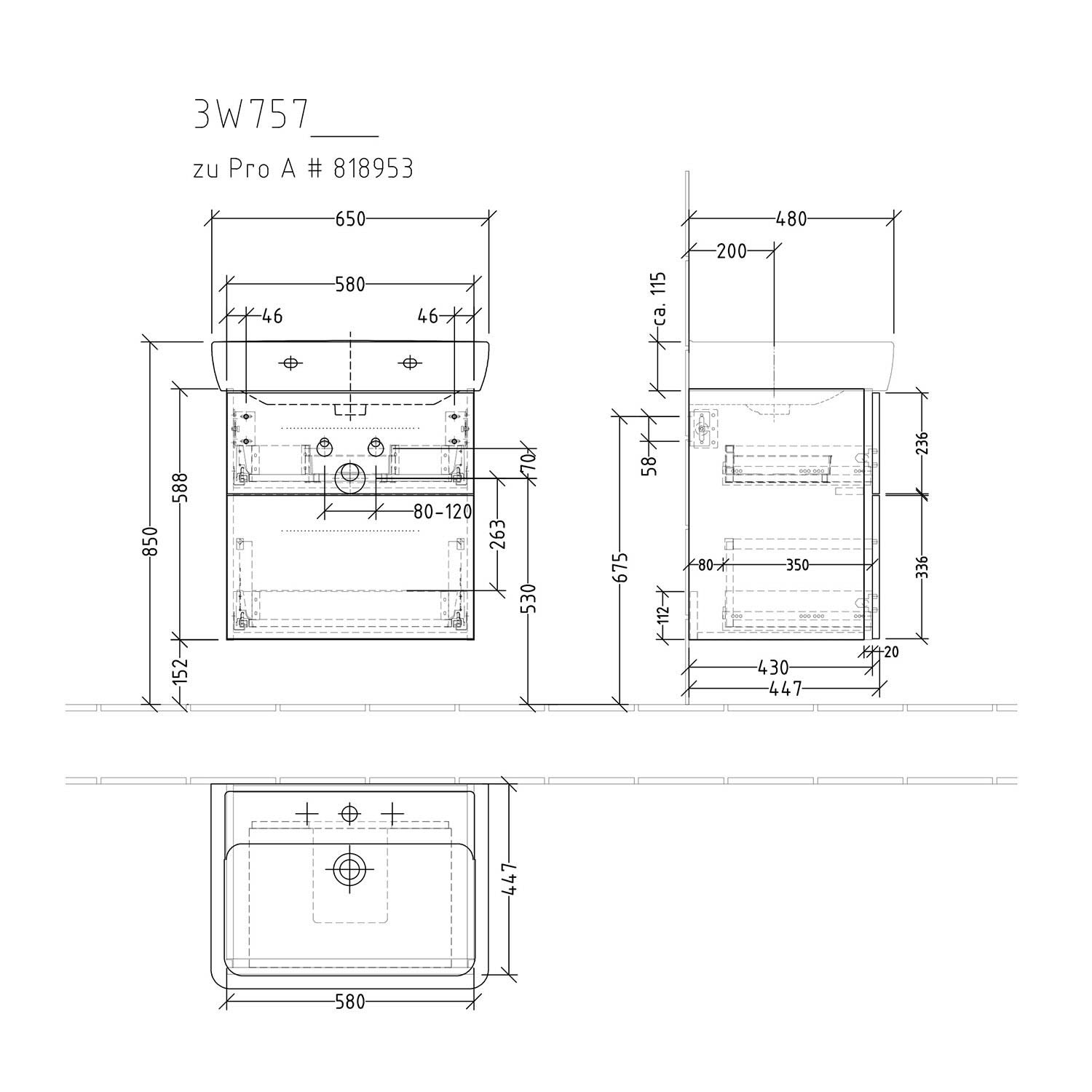 Sanipa 3way Waschtischunterbau für Keramik-Waschtisch Pro A 65 cm, 2 Auszüge mit Griffleisten