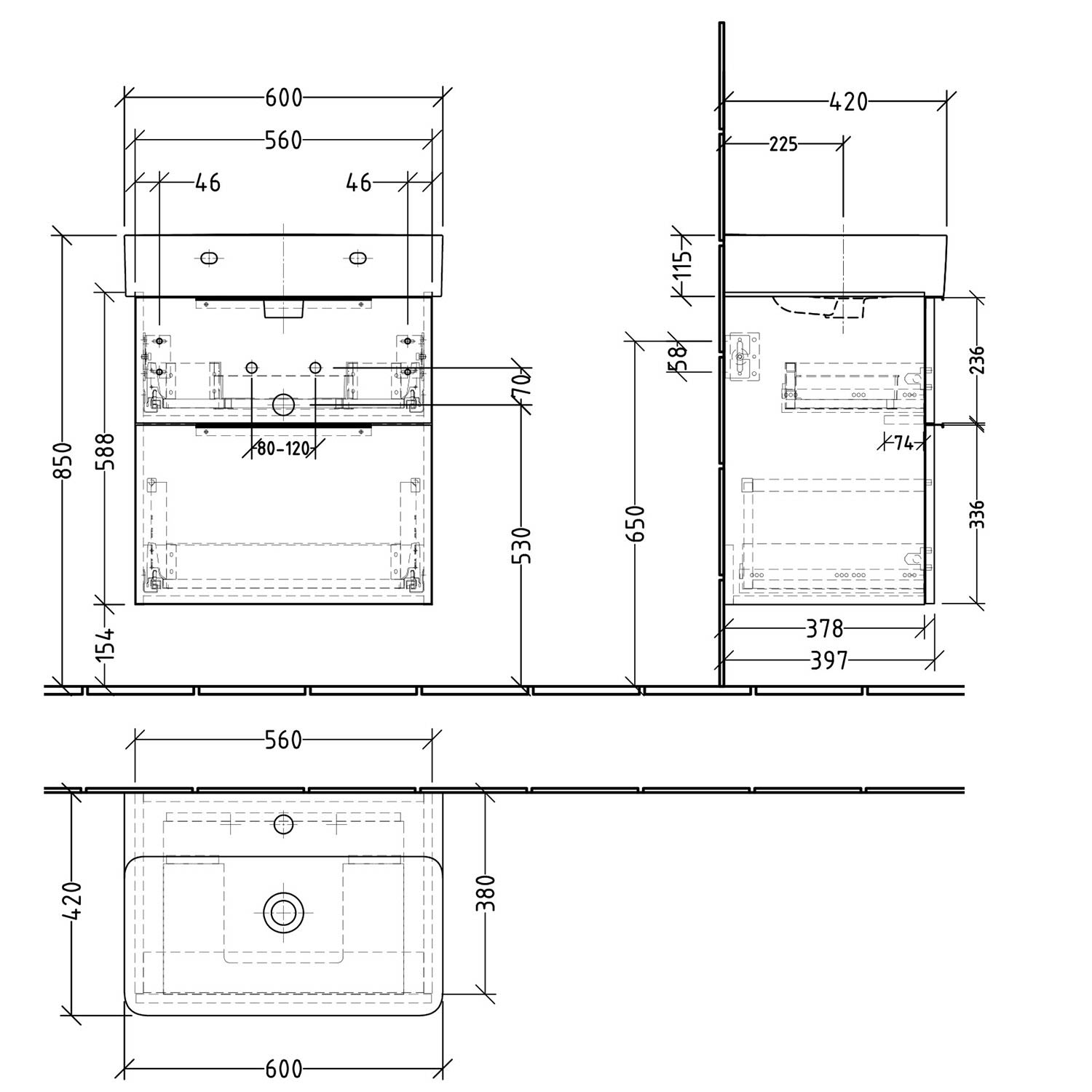 Sanipa 3way Waschtischunterbau für Keramik-Waschtisch Val 60 cm, 2 Auszüge mit Aufsatzgriff