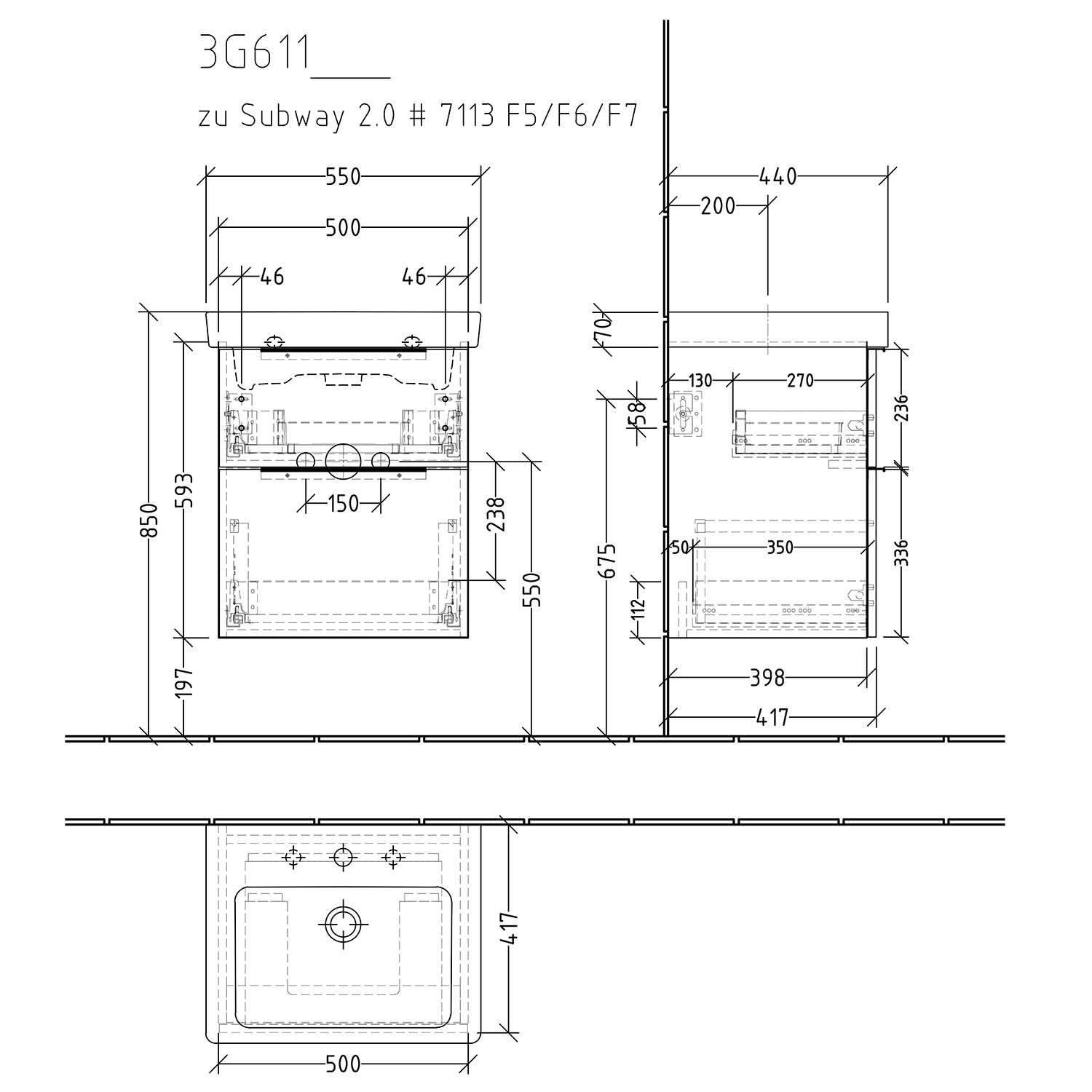 Sanipa 3way Waschtischunterbau für Keramik-Waschtisch Subway 2.0 55 cm, 2 Auszüge mit Aufsatzgriff