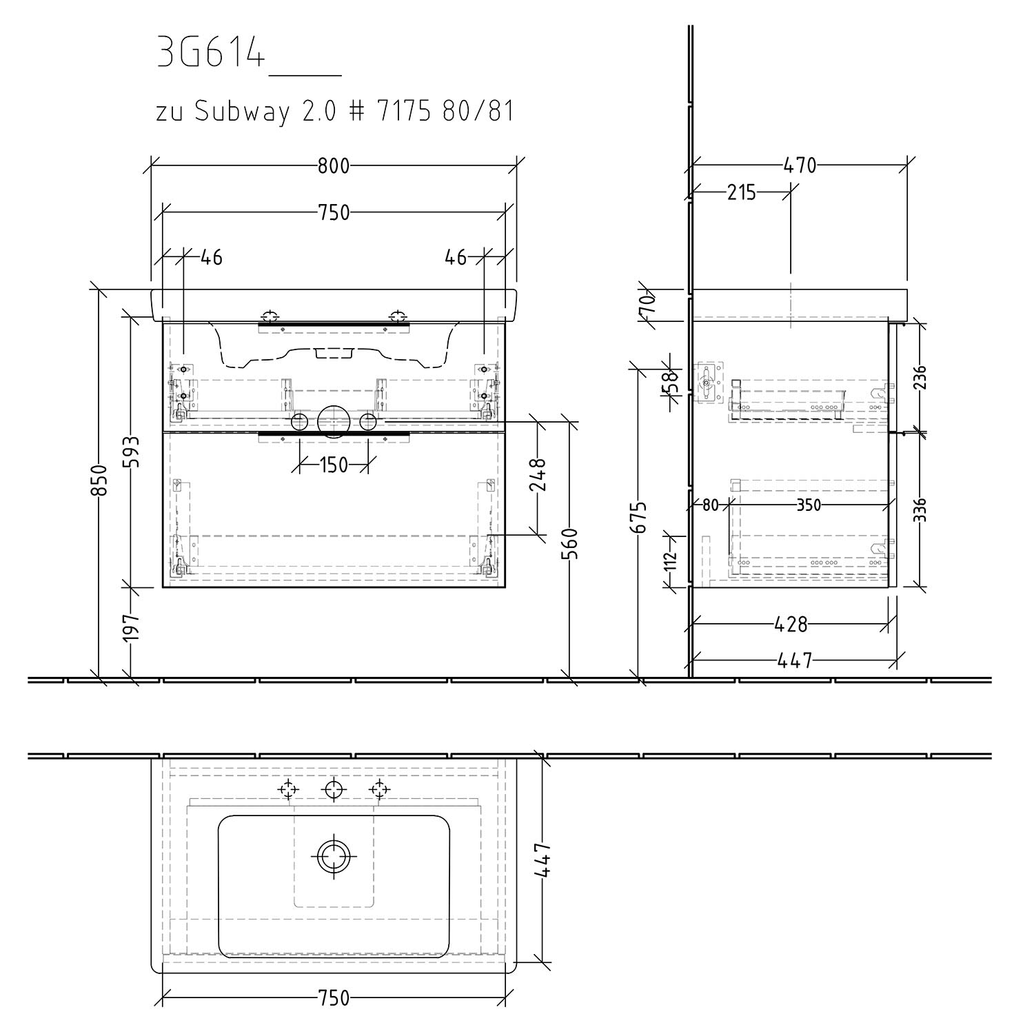 Sanipa 3way Waschtischunterbau für Keramik-Waschtisch Subway 2.0 80 cm, 2 Auszüge mit Aufsatzgriff