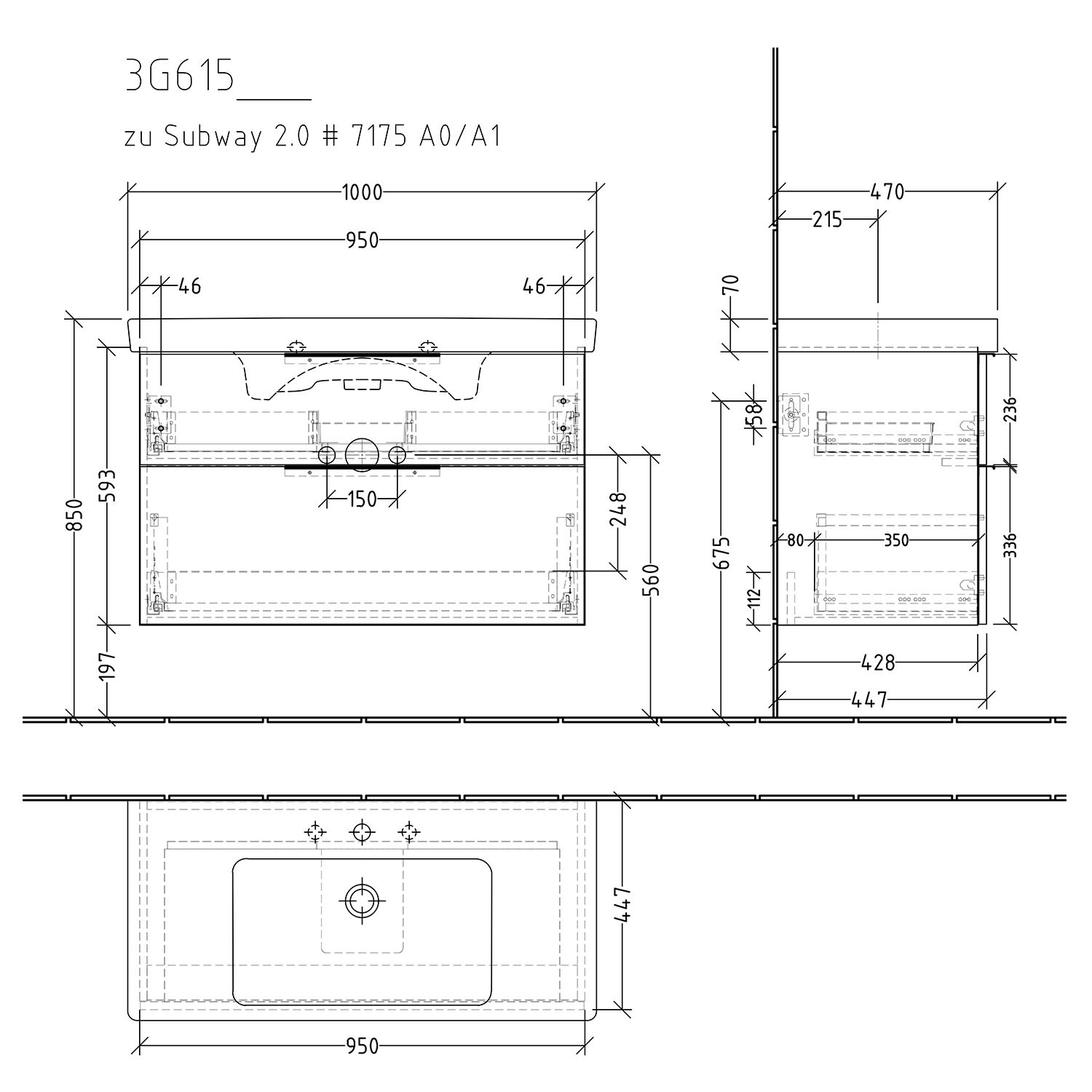 Sanipa 3way Waschtischunterbau für Keramik-Waschtisch Subway 2.0 100 cm, 2 Auszüge mit Aufsatzgriff