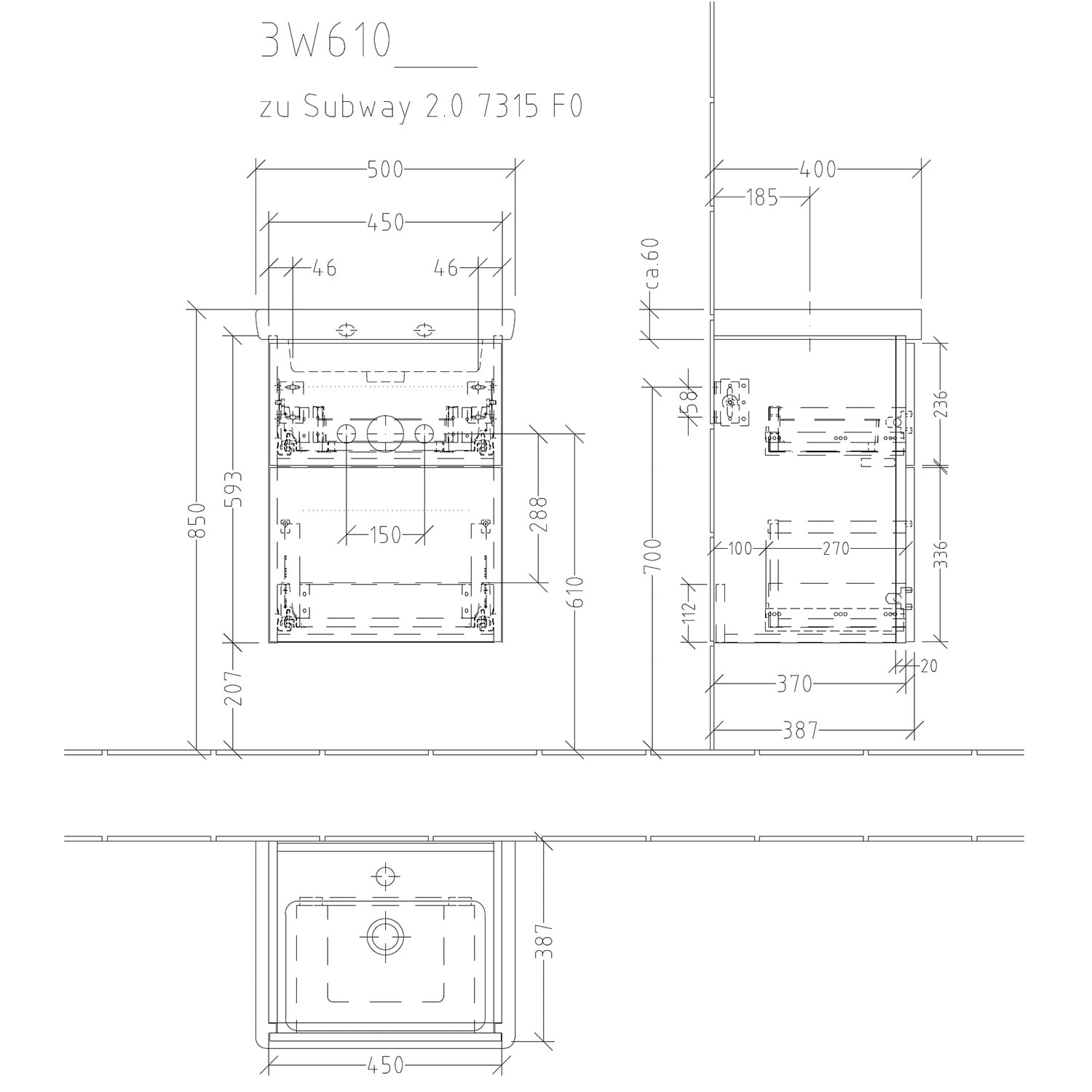 Sanipa 3way Waschtischunterbau für Keramik-Waschtisch Subway 2.0 50 cm, 2 Auszüge mit Griffleisten