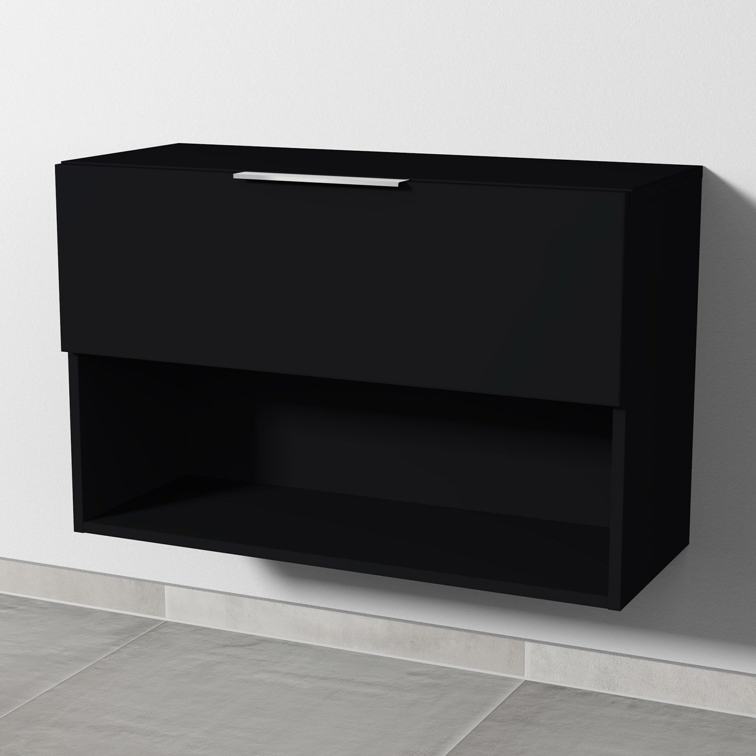 - 1 Metall-Vollauszug mit elegantem Aufsatz-Griff in Chrom (auf Anfrage optional auch in Schwarz-matt erhältlich)
