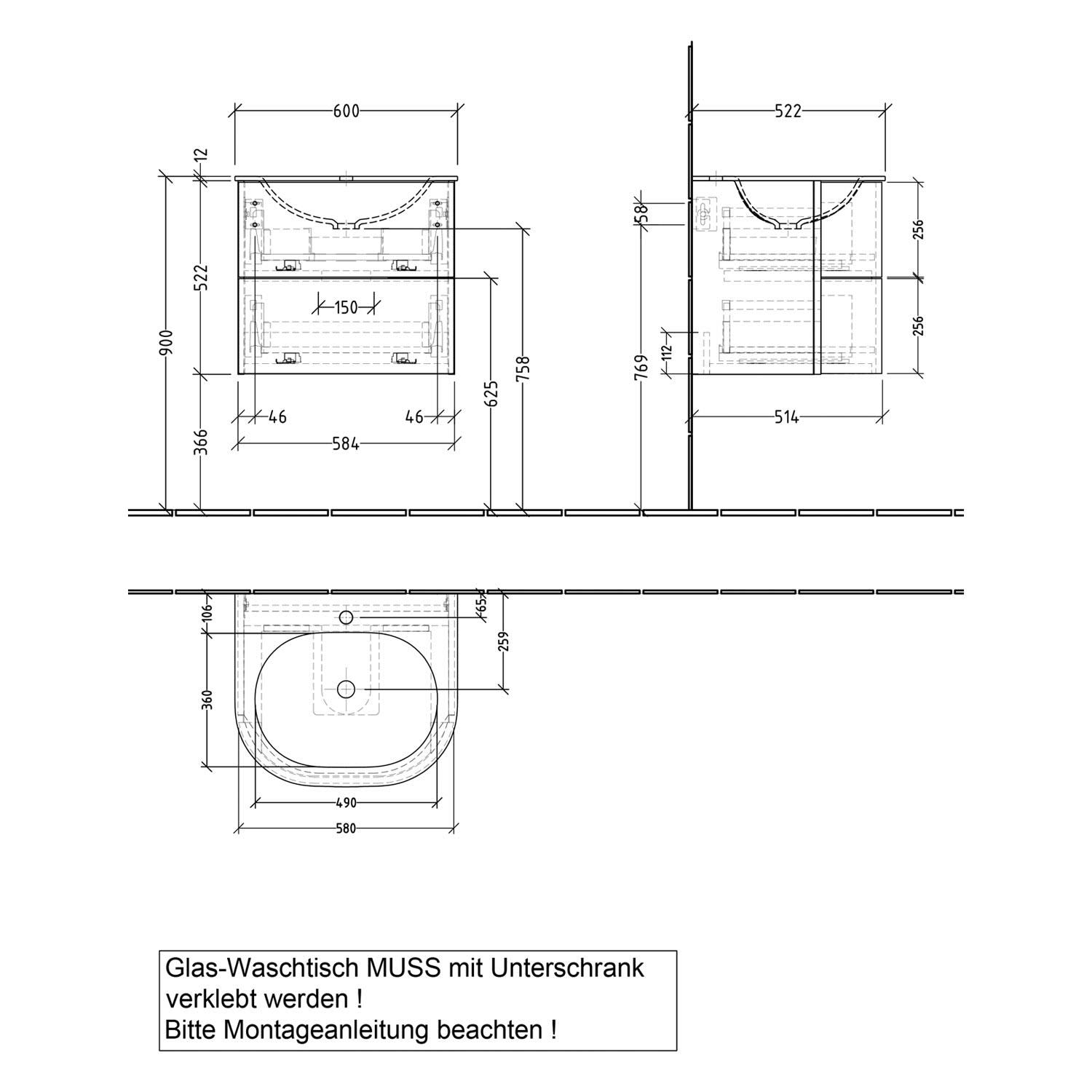 - Waschtisch ist nicht freitragend, nur mit Möbel montierbar