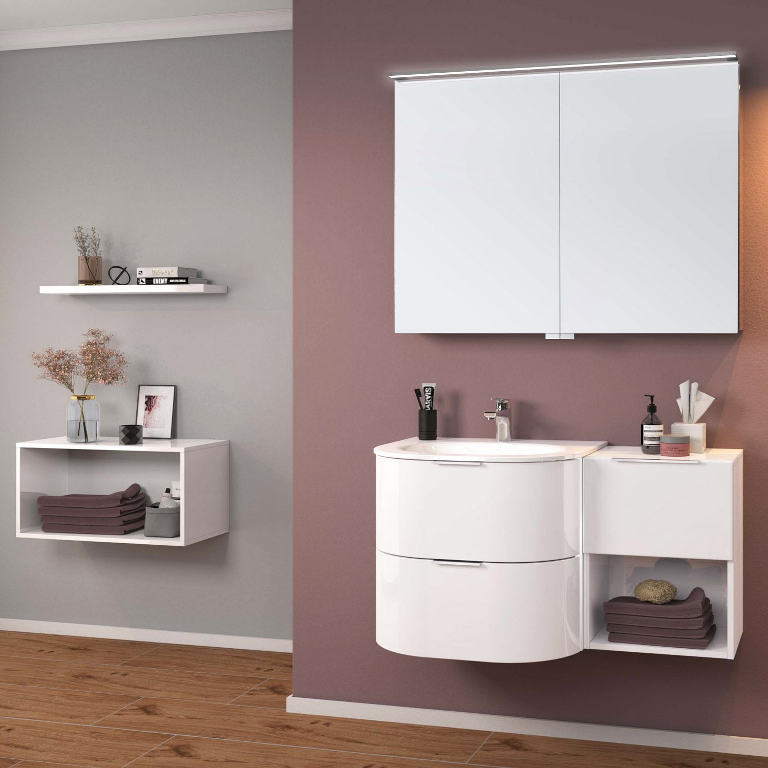 - gebogene Fronten, Material: mitteldichte Faserplatte (MDF), Oberfläche Thermofolie, weiß hochglanz Acrylfolie