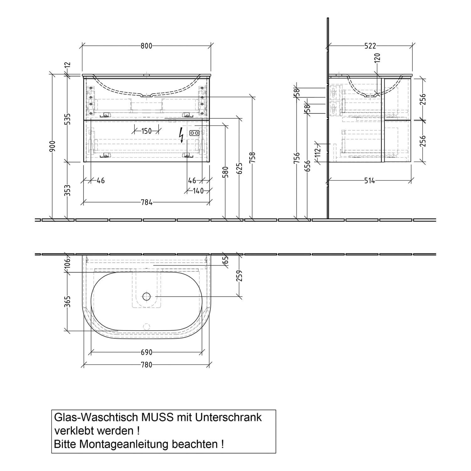 - Waschtisch nur mit Möbel montieren, ist nicht freitragend