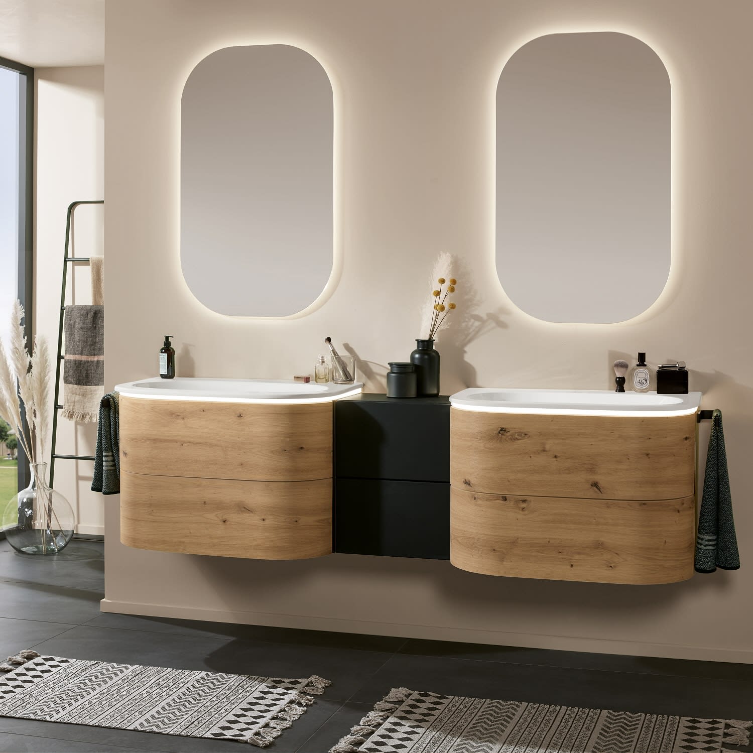 Sanipa 4balance Keramik-Waschtisch + Waschtischunterbau 80 cm mit 2 Auszügen, LED, ohne Hahnlochbohrung
