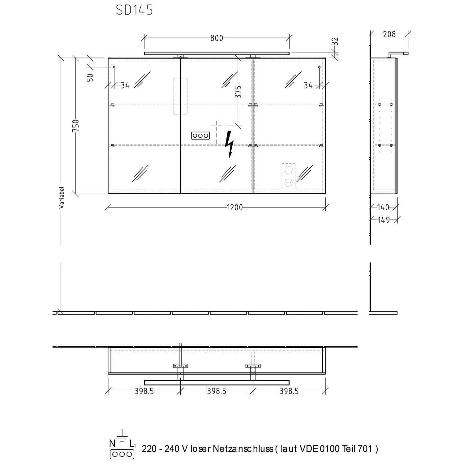 - 1 innenliegende Steckdose unten, rechts