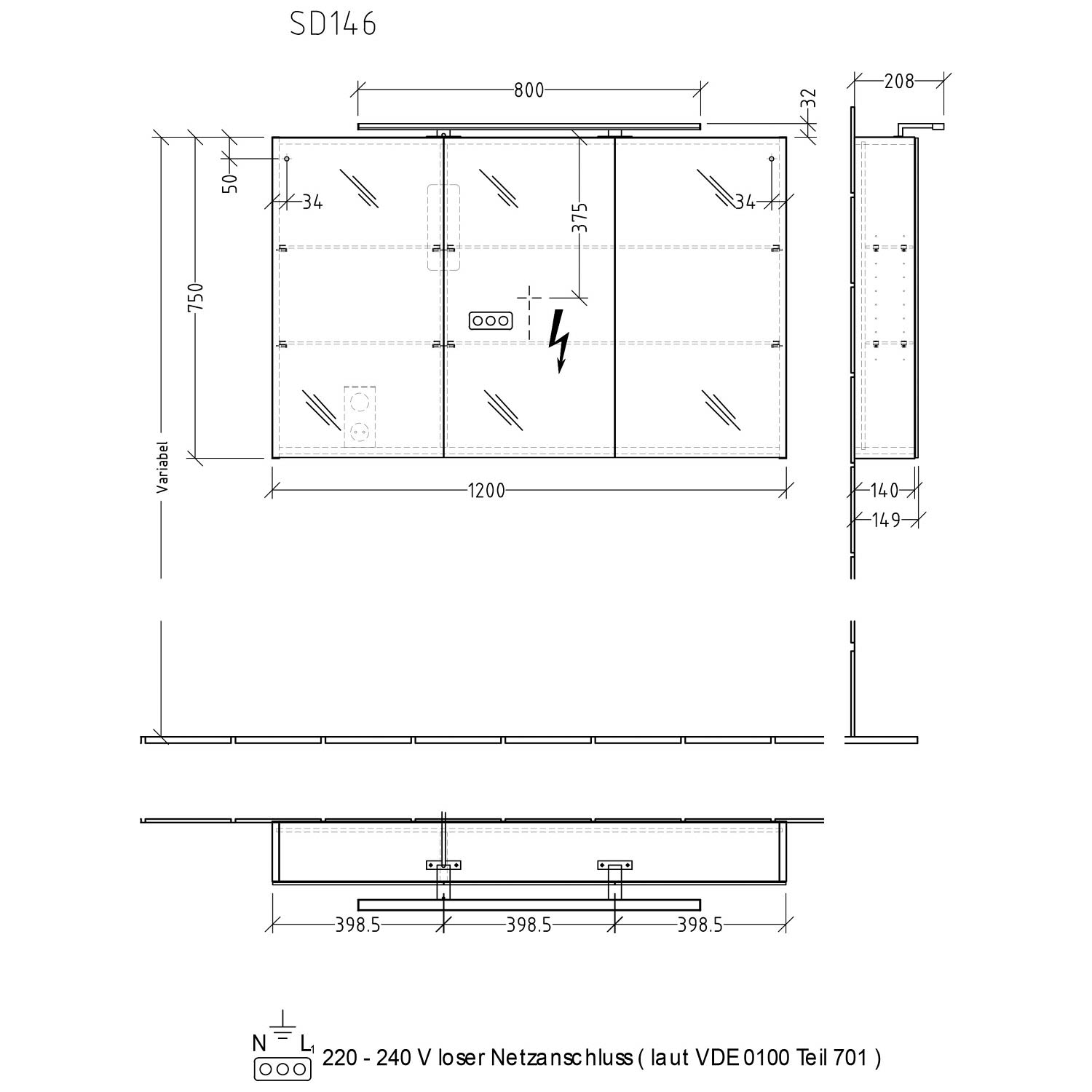 - 1 innenliegende Steckdose unten, links
