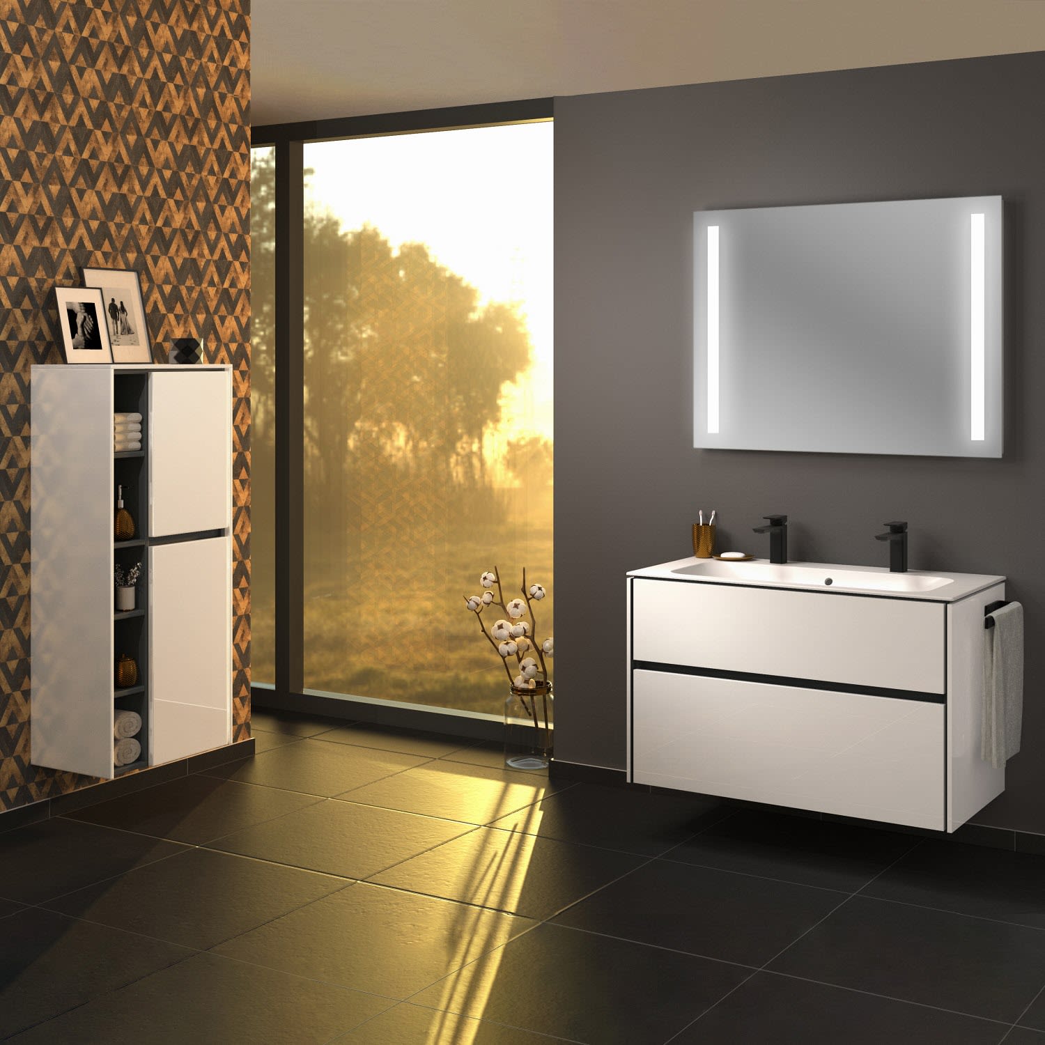 Sanipa Twiga Keramik-Doppelwaschtisch Finion 100 cm mit Unterschrank, 2 Auszüge, inkl. LED-Beleuchtung