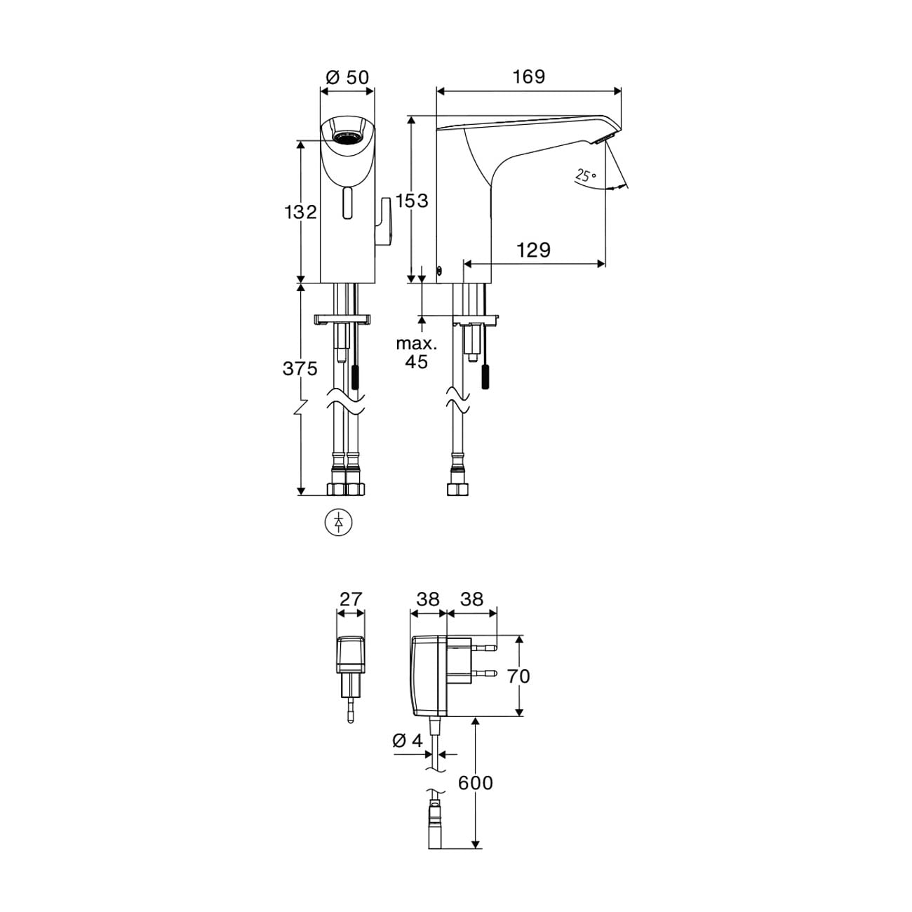 Schell XERIS E² Elektronische Waschtisch-Armatur mit Stecker-Netzteil, Hochdruck-Mischwasser, M