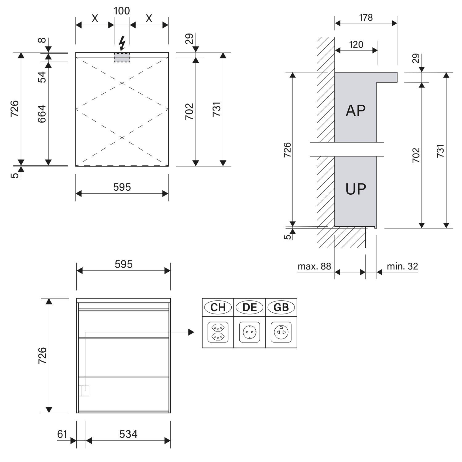 Schneider BORDO TW Spiegelschrank ALU1 60/1/TW/L 59,5 x 73,1 cm, Steckdose links, CH