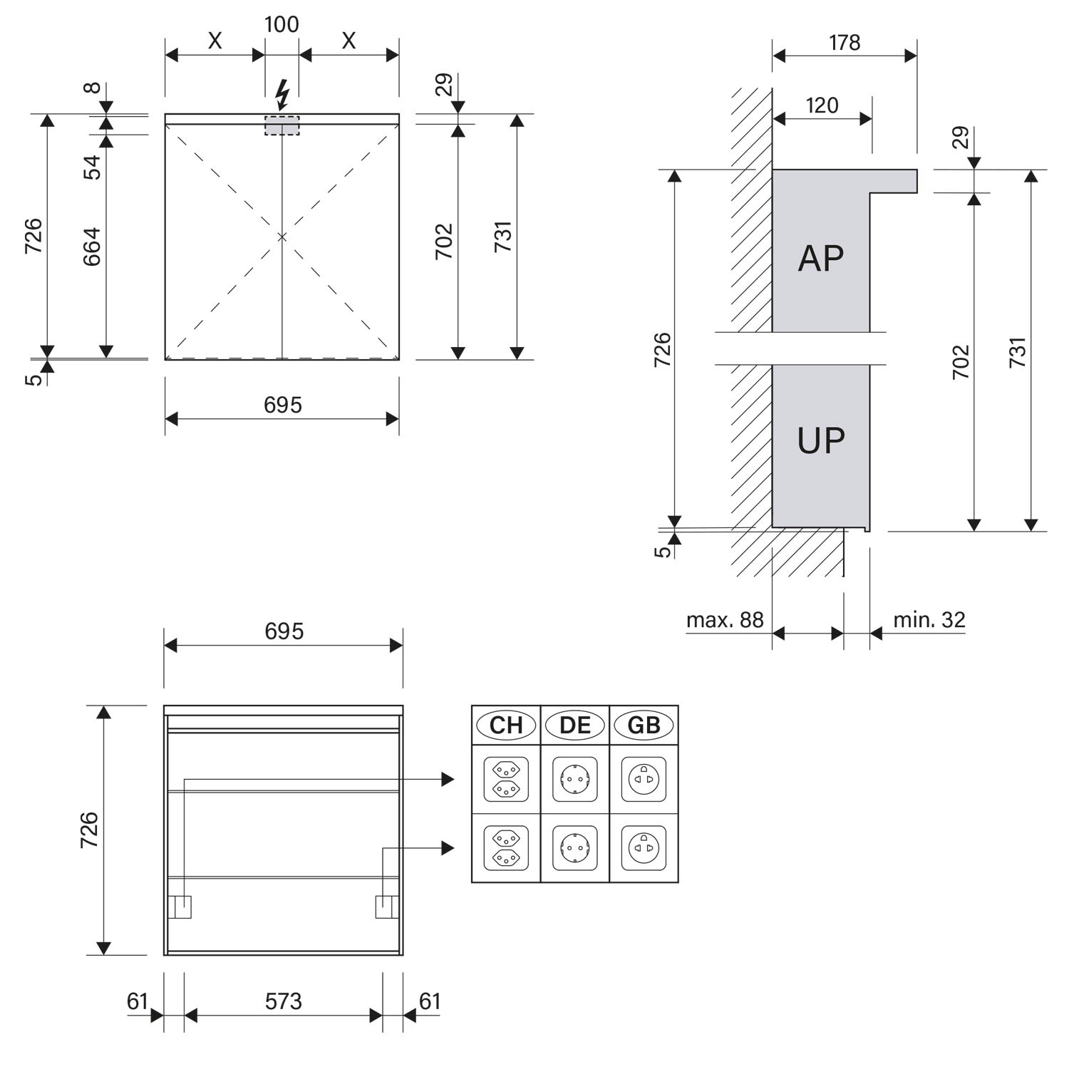 - Aufputz- oder Unterputz-Montage, maximale Einbautiefe 8,8 cm