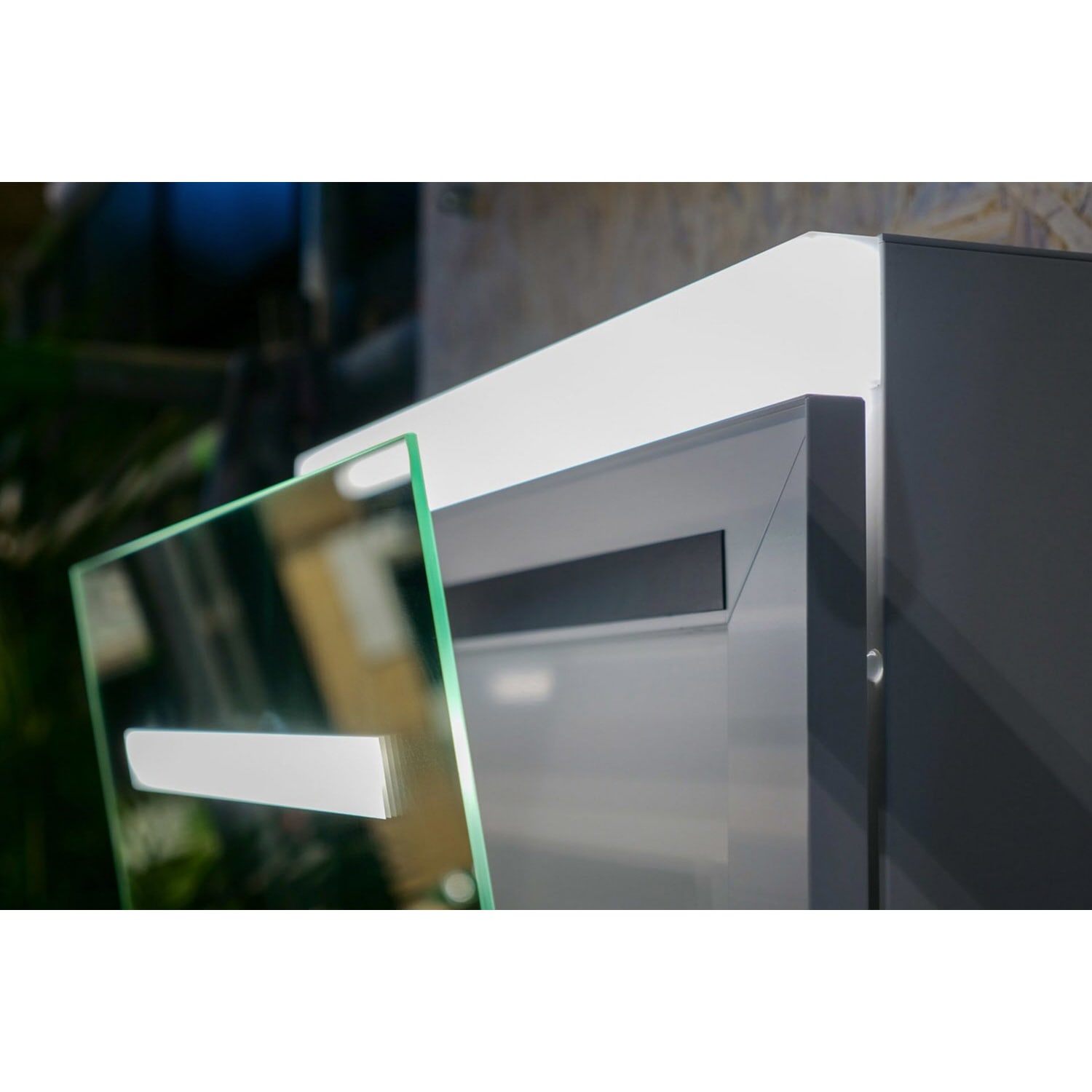 - Variante K: Lichtband im Spiegel beginnt mit dem Kippen der Spiegeltüre automatisch zu leuchten