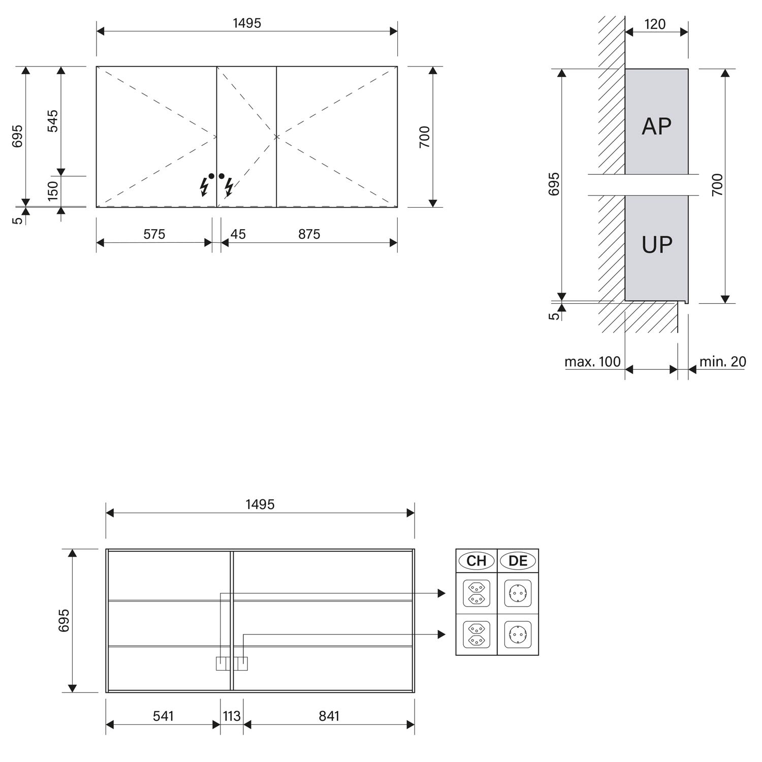 Schneider EASY Spiegelschrank ELC1 150/3/0/SD 149,5 x 70 cm, 2 Steckdosen, DE