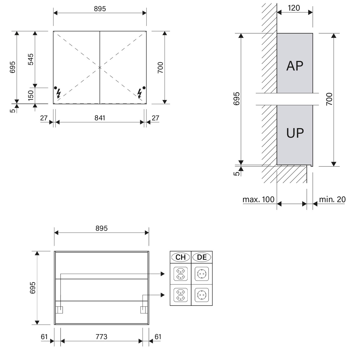 Schneider EASY Spiegelschrank ELC1 90/2/0/SD 89,5 x 70 cm, 2 Steckdosen, CH