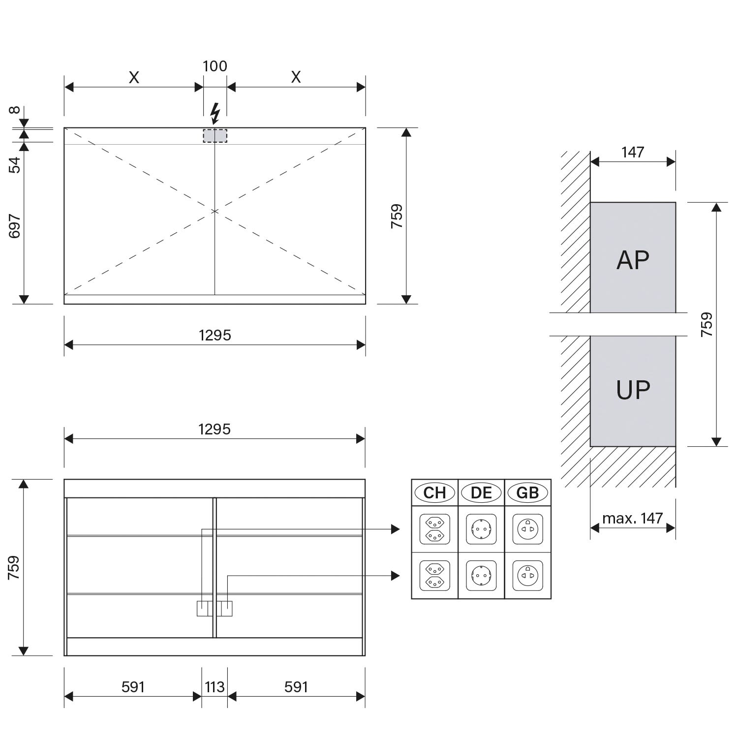 - Steckdosen unten an der Zwischenwand