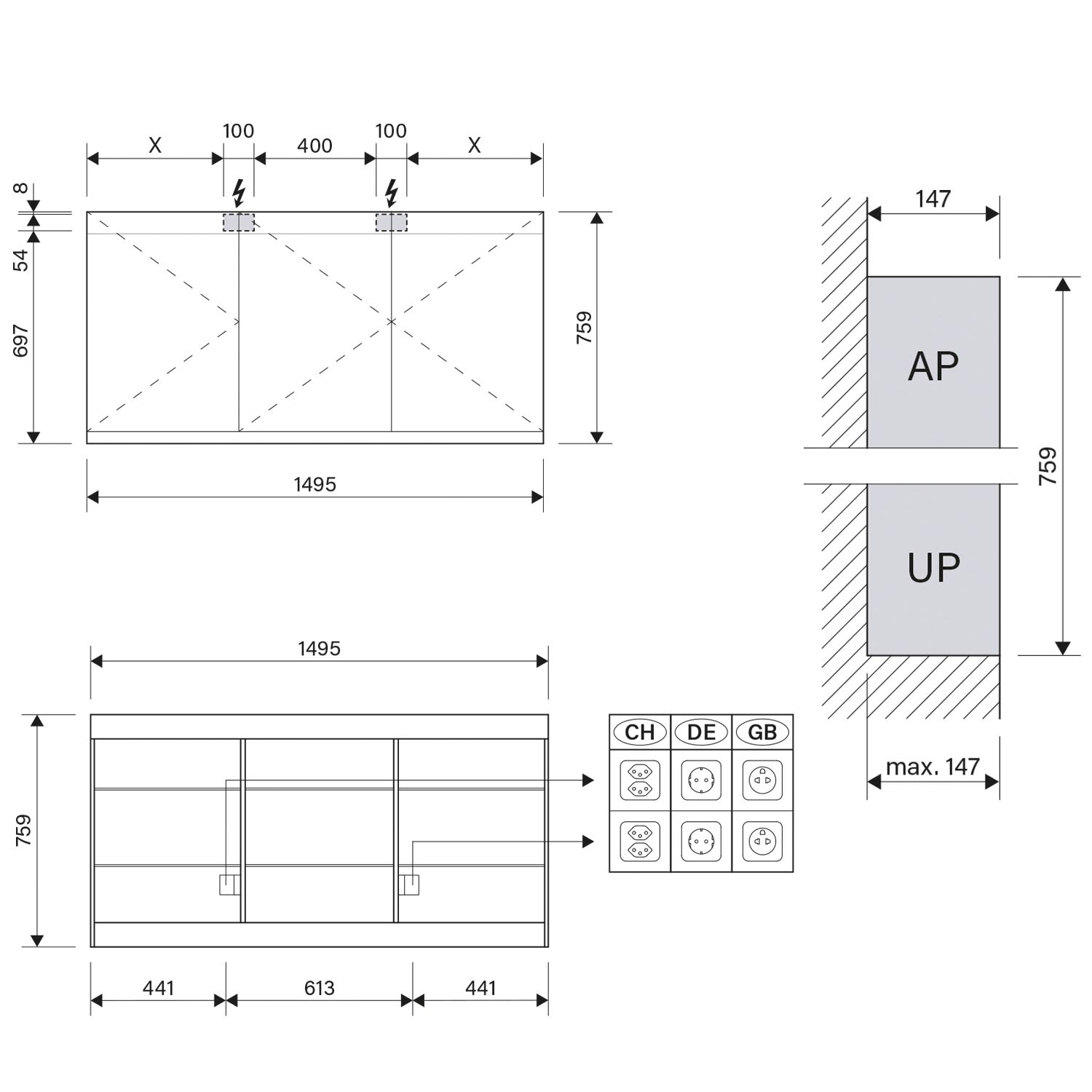 - Steckdosen unten an der Zwischenwand