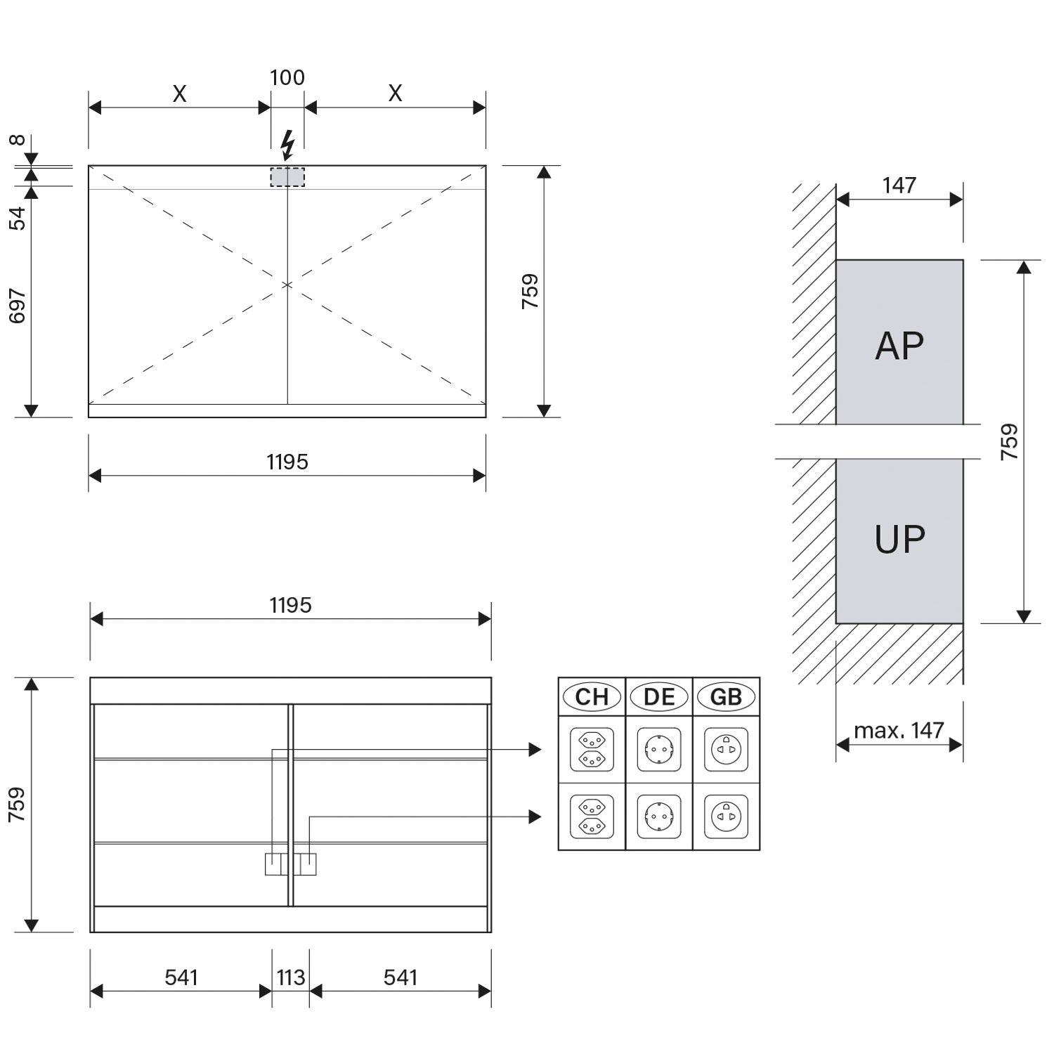 - Steckdosen unten an der Zwischenwand