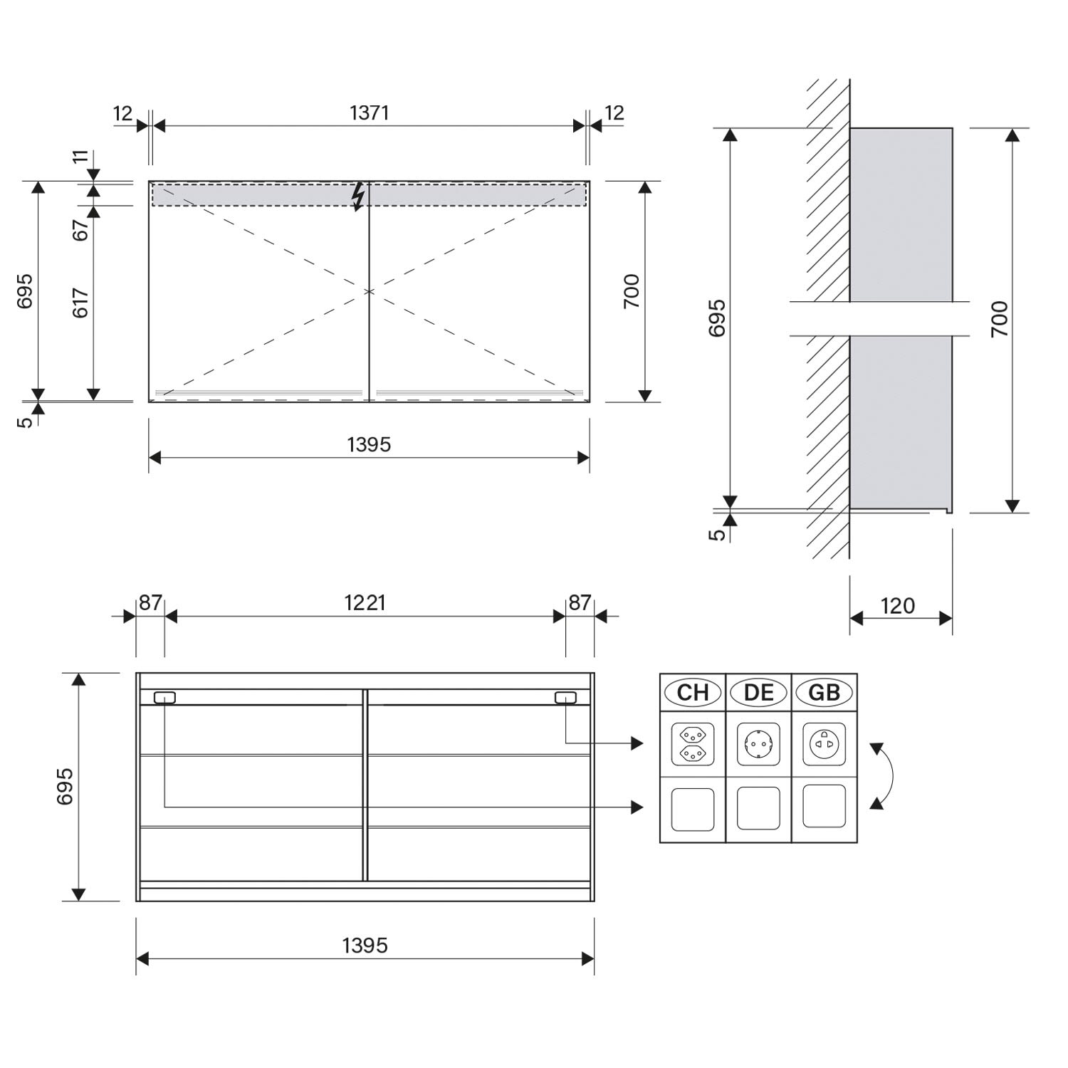 - Steckdose oben rechts, wechselbar nach links