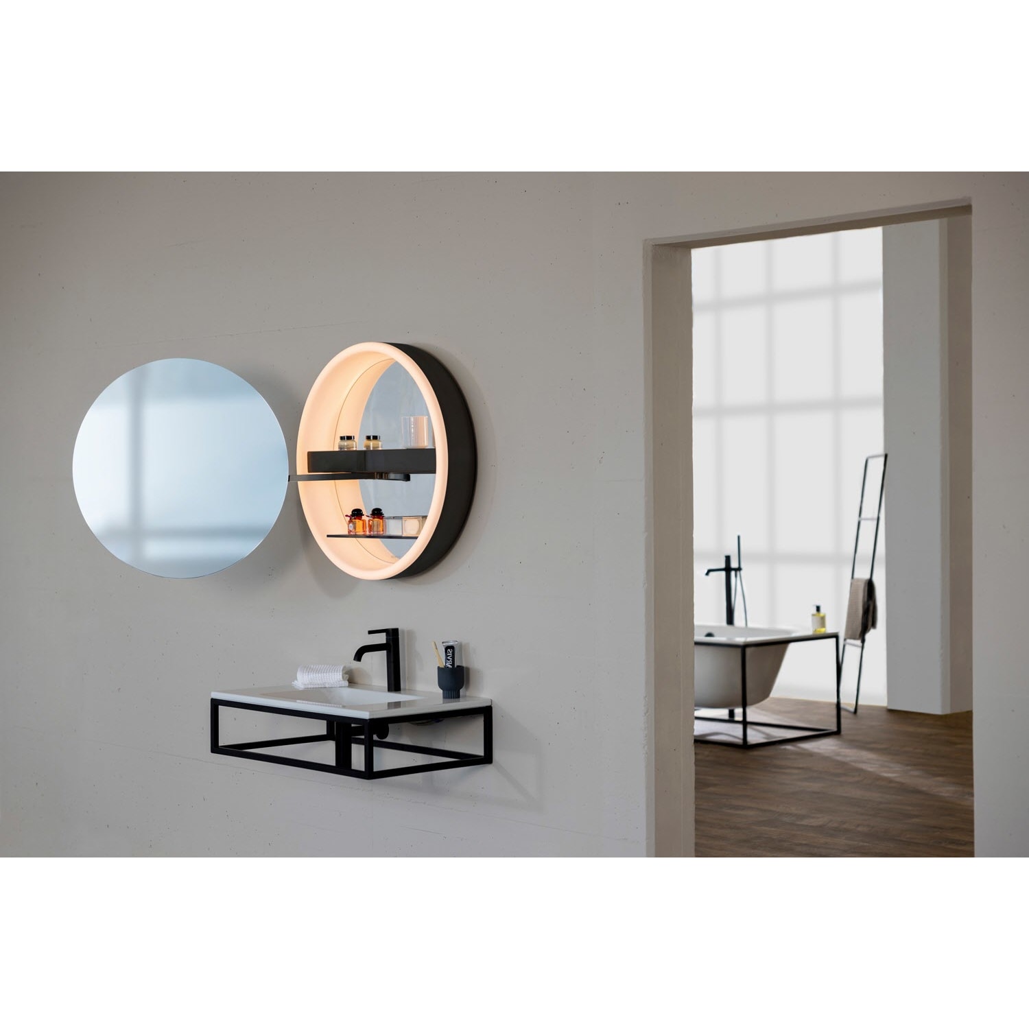 Der Mond ist aufgegangen. Am Himmel hell und klar, in Ihrem Bad schlicht und schön. LUNE ist inspiriert von der Eklipse. Ein feiner Lichtkranz, der entsteht, wenn sich der Mond vollständig vor die Sonne schiebt. Tauchen Sie ein in eine neue Sphäre des Wohlbefindens: Der runde Spiegelschrank – der erste seiner Art – besticht durch eine klare Form, stimmiges Licht mit Dim2Warm-Funktion und hochwertige Materialien.