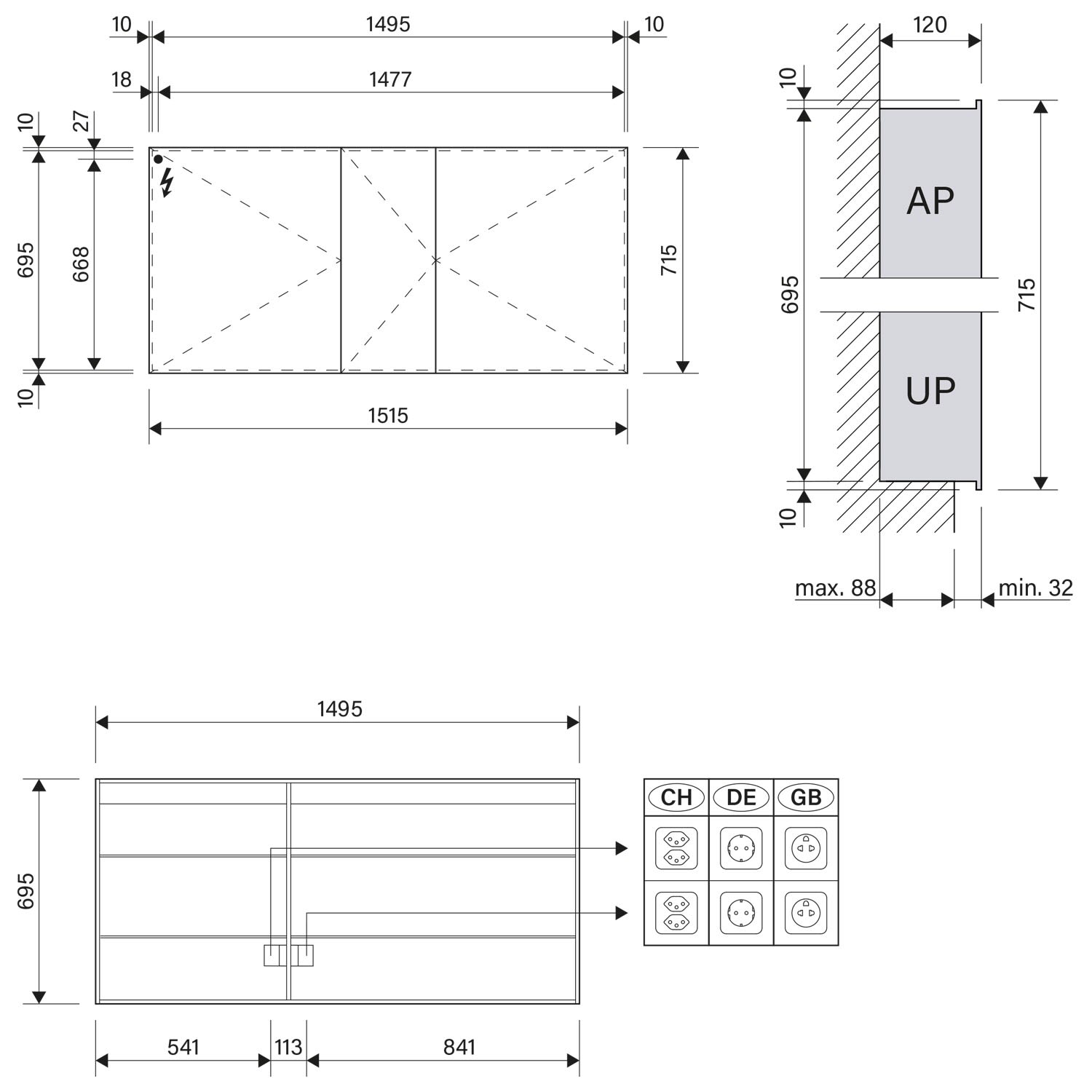 Schneider STYLE TW Spiegelschrank ALC2 150/3/TW 151,5 x 71,5 cm, DE