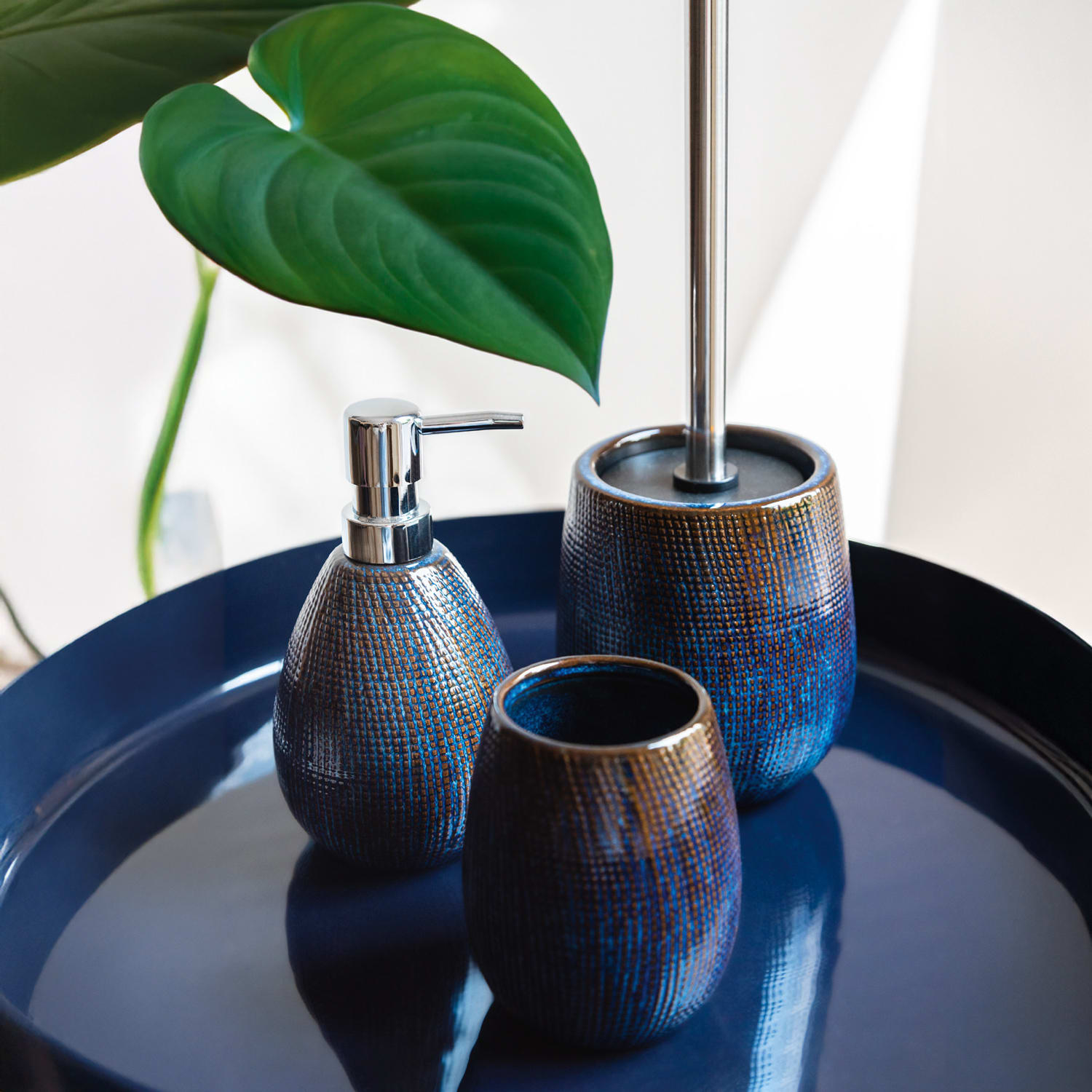 Der wohl persönlichste Raum Ihres Zuhauses bietet viele gestalterische Möglichkeiten. Lassen Sie sich inspirieren und bringen Sie mit den Bad-Accessoires und dem Duschzubehör der SCHÖNER WOHNEN-Kollektion Funktionalität und Stil in Ihr Badezimmer. Eleganter Blickfang: Das 3-teilige Bad-Accessoire Set Ronta besteht aus einer WC-Garnitur, einem Seifenspender und einem Zahnputzbecher. Die Bad-Serie ist aus einer hochwertigen Keramik hergestellt. Durch das Auftragen einer speziellen Effektglasur entsteht ein aufregendes und individuelles Farbzusammenspiel von Blau und Braun: Jedes Stück dieser Bad-Serie ist ein Unikat. Der nachfüllbare Seifenspender hat ein Fassungsvermögen von ca. 450 ml und misst (B x H x t): 9,5 x 17,5 x 9 cm. Der Pumpkopf aus stabilem Kunststoff in glänzender Chrom-Optik ermöglicht eine präzise Dosierung der Flüssigseife. Ihre Zahnpflege-Utensilien sind im Zahnputzbecher ordentlich verwahrt und stehen stets griffbereit. Dank der rutschhemmend beschichteten Unterseite haben der Seifenspender und der Zahnputzbecher einen festen und sicheren Stand auf dem Waschbeckenrand. Der Becher hat Abmessungen von (B/T x H): Ø 9 x 11 cm. Die WC-Garnitur beinhaltet eine WC-Bürste mit einem eleganten Edelstahlstiehl. Der Bürstenkopf ist aus robustem schwarzem Kunststoff gefertigt und gewährleistet eine gründliche Reinigung. Mit der Silikonabdeckung oberhalb der WC-Bürste bleibt das Innere des Bürstenhalters zudem diskret verborgen. Insgesamt misst die Garnitur (B/T x H): Ø 11,5 x 38,5 cm. Die einzigartigen Bad-Accessoires der Serie Ronta aus der SCHÖNER WOHNEN-Kollektion setzen durch die ungewöhnliche Farbgestaltung moderne Akzente in Ihrem Badezimmer.