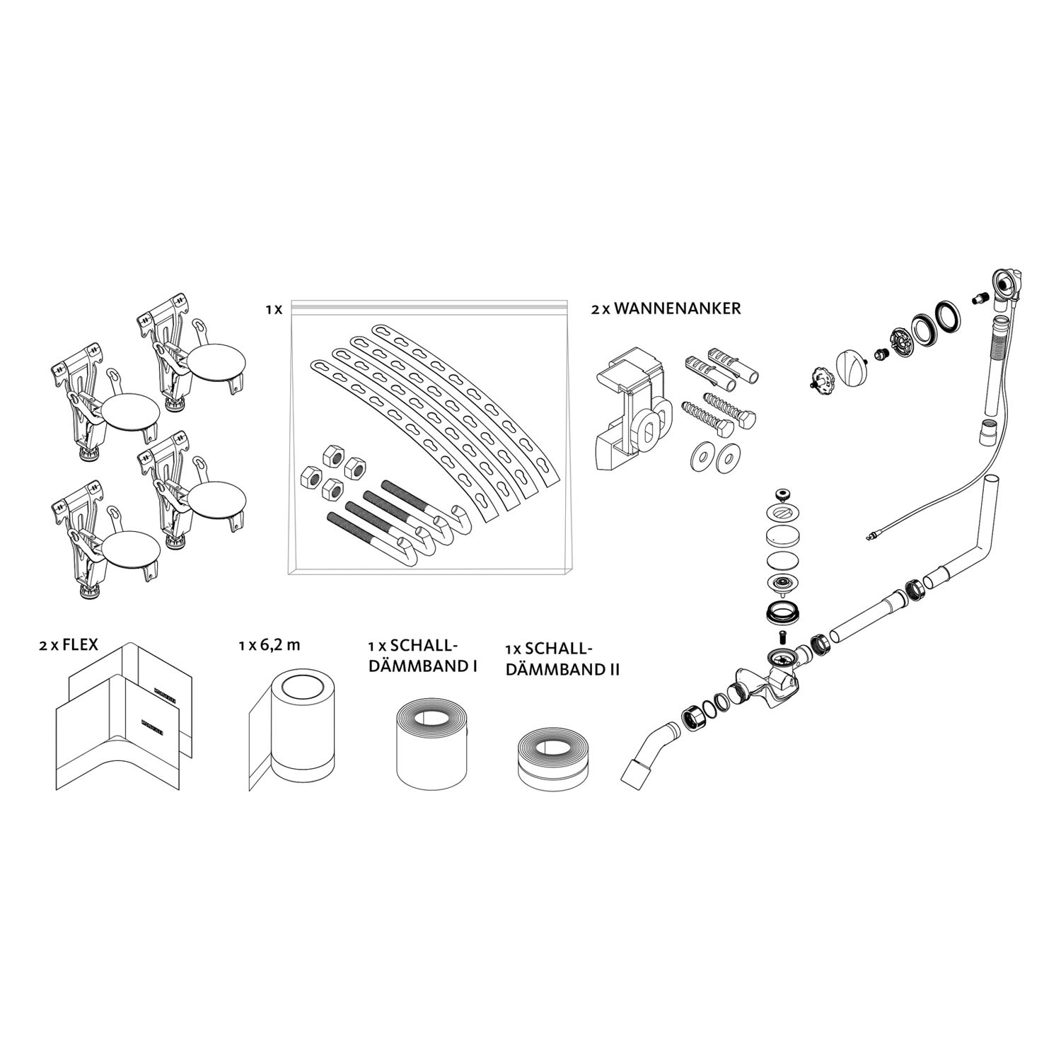 Die Montage der aufeinander abgestimmten Teile ist mühelos und zeitsparend, sodass Sie sich schnell an Ihrem neuen Badezimmererlebnis erfreuen können. Dank der Verwendung von Wannenankern und robusten, höhenverstellbaren Wannenfüßen steht Ihre Badewanne stabil und sicher.